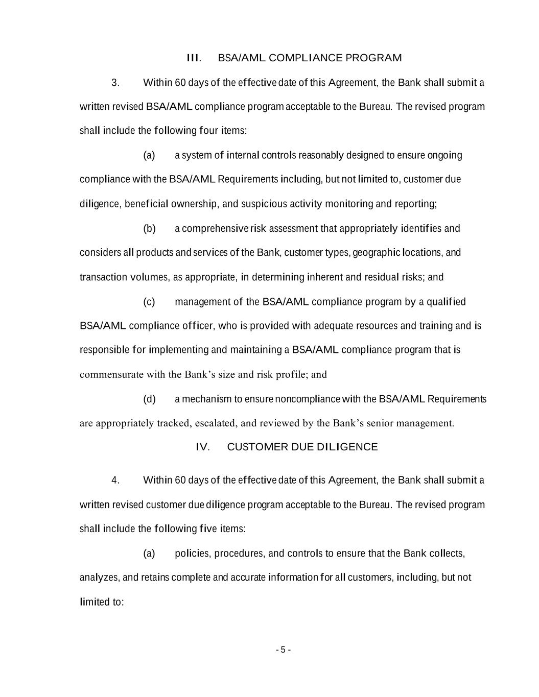 - 5 - III. BSA/AML COMPLIANCE PROGRAM 3. Within 60 days of the effective date of this Agreement, the Bank shall submit a written revised BSA/AML compliance program acceptable to the Bureau. The revised program shall include the following four items: (a) a system of internal controls reasonably designed to ensure ongoing compliance with the BSA/AML Requirements including, but not limited to, customer due diligence, beneficial ownership, and suspicious activity monitoring and reporting; (b) a comprehensive risk assessment that appropriately identifies and considers all products and services of the Bank, customer types, geographic locations, and transaction volumes, as appropriate, in determining inherent and residual risks; and (c) management of the BSA/AML compliance program by a qualified BSA/AML compliance officer, who is provided with adequate resources and training and is responsible for implementing and maintaining a BSA/AML compliance program that is commensurate with the Bank’s size and risk profile; and (d) a mechanism to ensure noncompliance with the BSA/AML Requirements are appropriately tracked, escalated, and reviewed by the Bank’s senior management. IV. CUSTOMER DUE DILIGENCE 4. Within 60 days of the effective date of this Agreement, the Bank shall submit a written revised customer due diligence program acceptable to the Bureau. The revised program shall include the following five items: (a) policies, procedures, and controls to ensure that the Bank collects, analyzes, and retains complete and accurate information for all customers, including, but not limited to: