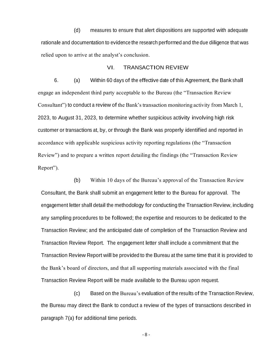 - 8 - (d) measures to ensure that alert dispositions are supported with adequate rationale and documentation to evidence the research performed and the due diligence that was relied upon to arrive at the analyst’s conclusion. VI. TRANSACTION REVIEW 6. (a) Within 60 days of the effective date of this Agreement, the Bank shall engage an independent third party acceptable to the Bureau (the “Transaction Review Consultant”) to conduct a review of the Bank’s transaction monitoring activity from March 1, 2023, to August 31, 2023, to determine whether suspicious activity involving high risk customer or transactions at, by, or through the Bank was properly identified and reported in accordance with applicable suspicious activity reporting regulations (the “Transaction Review”) and to prepare a written report detailing the findings (the “Transaction Review Report”). (b) Within 10 days of the Bureau’s approval of the Transaction Review Consultant, the Bank shall submit an engagement letter to the Bureau for approval. The engagement letter shall detail the methodology for conducting the Transaction Review, including any sampling procedures to be followed; the expertise and resources to be dedicated to the Transaction Review; and the anticipated date of completion of the Transaction Review and Transaction Review Report. The engagement letter shall include a commitment that the Transaction Review Report will be provided to the Bureau at the same time that it is provided to the Bank’s board of directors, and that all supporting materials associated with the final Transaction Review Report will be made available to the Bureau upon request. (c) Based on the Bureau’s evaluation of the results of the Transaction Review, the Bureau may direct the Bank to conduct a review of the types of transactions described in paragraph 7(a) for additional time periods.