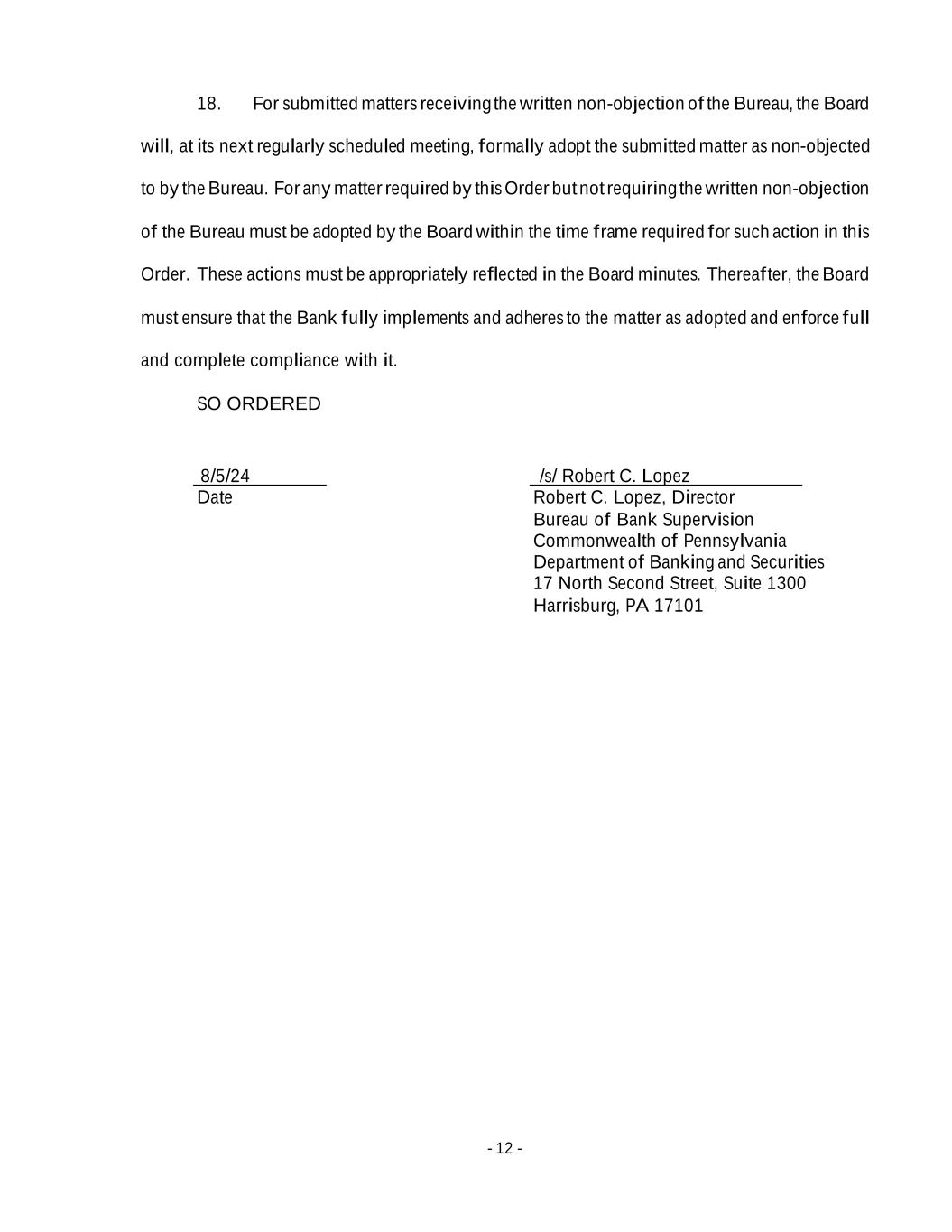 - 12 - 18. For submitted matters receiving the written non-objection of the Bureau, the Board will, at its next regularly scheduled meeting, formally adopt the submitted matter as non-objected to by the Bureau. For any matter required by this Order but not requiring the written non-objection of the Bureau must be adopted by the Board within the time frame required for such action in this Order. These actions must be appropriately reflected in the Board minutes. Thereafter, the Board must ensure that the Bank fully implements and adheres to the matter as adopted and enforce full and complete compliance with it. SO ORDERED 8/5/24 /s/ Robert C. Lopez Date Robert C. Lopez, Director Bureau of Bank Supervision Commonwealth of Pennsylvania Department of Banking and Securities 17 North Second Street, Suite 1300 Harrisburg, PA 17101
