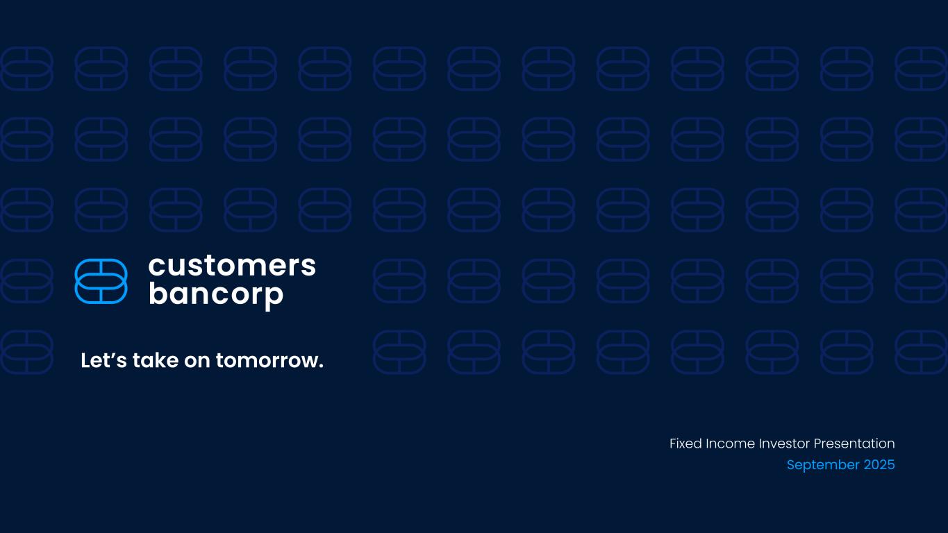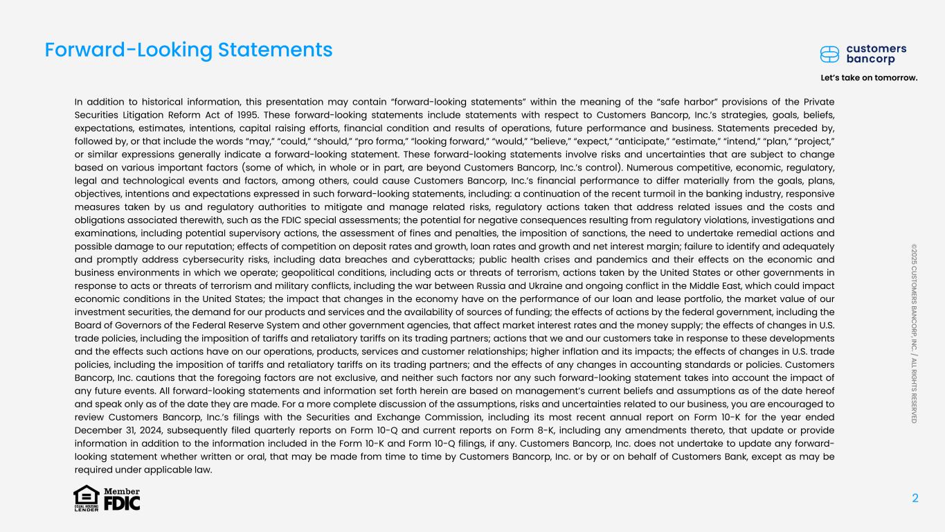 Let’s take on tomorrow. 2 © 2025 C USTO M ERS BANC O RP, INC . / ALL RIG HTS RESERVED In addition to historical information, this presentation may contain “forward-looking statements” within the meaning of the “safe harbor” provisions of the Private Securities Litigation Reform Act of 1995. These forward-looking statements include statements with respect to Customers Bancorp, Inc.’s strategies, goals, beliefs, expectations, estimates, intentions, capital raising efforts, financial condition and results of operations, future performance and business. Statements preceded by, followed by, or that include the words “may,” “could,” “should,” “pro forma,” “looking forward,” “would,” “believe,” “expect,” “anticipate,” “estimate,” “intend,” “plan,” “project,” or similar expressions generally indicate a forward-looking statement. These forward-looking statements involve risks and uncertainties that are subject to change based on various important factors (some of which, in whole or in part, are beyond Customers Bancorp, Inc.’s control). Numerous competitive, economic, regulatory, legal and technological events and factors, among others, could cause Customers Bancorp, Inc.’s financial performance to differ materially from the goals, plans, objectives, intentions and expectations expressed in such forward-looking statements, including: a continuation of the recent turmoil in the banking industry, responsive measures taken by us and regulatory authorities to mitigate and manage related risks, regulatory actions taken that address related issues and the costs and obligations associated therewith, such as the FDIC special assessments; the potential for negative consequences resulting from regulatory violations, investigations and examinations, including potential supervisory actions, the assessment of fines and penalties, the imposition of sanctions, the need to undertake remedial actions and possible damage to our reputation; effects of competition on deposit rates and growth, loan rates and growth and net interest margin; failure to identify and adequately and promptly address cybersecurity risks, including data breaches and cyberattacks; public health crises and pandemics and their effects on the economic and business environments in which we operate; geopolitical conditions, including acts or threats of terrorism, actions taken by the United States or other governments in response to acts or threats of terrorism and military conflicts, including the war between Russia and Ukraine and ongoing conflict in the Middle East, which could impact economic conditions in the United States; the impact that changes in the economy have on the performance of our loan and lease portfolio, the market value of our investment securities, the demand for our products and services and the availability of sources of funding; the effects of actions by the federal government, including the Board of Governors of the Federal Reserve System and other government agencies, that affect market interest rates and the money supply; the effects of changes in U.S. trade policies, including the imposition of tariffs and retaliatory tariffs on its trading partners; actions that we and our customers take in response to these developments and the effects such actions have on our operations, products, services and customer relationships; higher inflation and its impacts; the effects of changes in U.S. trade policies, including the imposition of tariffs and retaliatory tariffs on its trading partners; and the effects of any changes in accounting standards or policies. Customers Bancorp, Inc. cautions that the foregoing factors are not exclusive, and neither such factors nor any such forward-looking statement takes into account the impact of any future events. All forward-looking statements and information set forth herein are based on management’s current beliefs and assumptions as of the date hereof and speak only as of the date they are made. For a more complete discussion of the assumptions, risks and uncertainties related to our business, you are encouraged to review Customers Bancorp, Inc.’s filings with the Securities and Exchange Commission, including its most recent annual report on Form 10-K for the year ended December 31, 2024, subsequently filed quarterly reports on Form 10-Q and current reports on Form 8-K, including any amendments thereto, that update or provide information in addition to the information included in the Form 10-K and Form 10-Q filings, if any. Customers Bancorp, Inc. does not undertake to update any forward- looking statement whether written or oral, that may be made from time to time by Customers Bancorp, Inc. or by or on behalf of Customers Bank, except as may be required under applicable law. Forward-Looking Statements