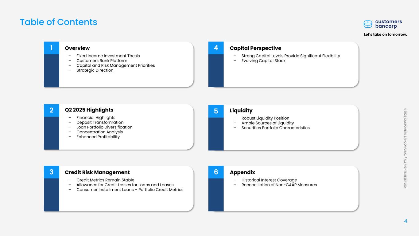 Let’s take on tomorrow. 3 © 2025 C USTO M ERS BANC O RP, INC . / ALL RIG HTS RESERVED This presentation has been prepared by Customers Bancorp solely for informational purposes and information contained herein constitutes confidential information and is provided to you on the condition that you will hold it in strict confidence and not reproduce, disclose, forward or distribute it to any third party in whole or in part without the prior written consent of the Customers Bancorp. This presentation shall not constitute an offer to sell or a solicitation of an offer to buy securities or an invitation or inducement to engage in investment activity nor shall there be any sale of securities in any jurisdiction in which such offer, solicitation or sale would be unlawful prior to registration or qualification of such securities under the securities law of any such jurisdiction. Customers Bancorp has an effective shelf registration statement (including a base prospectus) on file with the Securities and Exchange Commission (the “SEC”). Any offering of securities will be made only by means of a prospectus supplement and accompanying prospectus filed with the SEC. In the event Customers Bancorp proceeds with an offering, you may obtain a copy of the preliminary prospectus supplement and accompanying prospectus for the offering for free by visiting EDGAR on the SEC website at www.sec.gov. Alternatively, Customers Bancorp will arrange to send you the prospectus if you request it by contacting Carter Brown. NON-GAAP FINANCIAL MEASURES This presentation includes financial information prepared in accordance with accounting principles generally accepted in the United States (“GAAP”). This presentation also includes non-GAAP financial information, which should be considered supplemental to, not a substitute for, or superior to, the financial measure calculated in accordance with GAAP. There are a number of limitations related to the use of these non-GAAP financial measures and their nearest GAAP equivalents. For example, Customers Bancorp’s definitions of non-GAAP financial measures may differ from non-GAAP financial measures used by other companies. For reconciliations to the most directly comparable GAAP measure, see the appendix to this presentation. Forward-Looking Statements (Cont.)