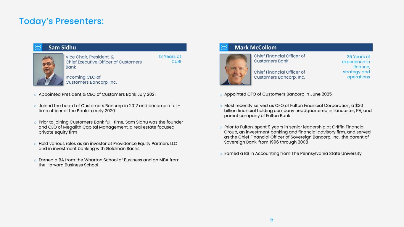 Let’s take on tomorrow. 4 © 2025 C USTO M ERS BANC O RP, INC . / ALL RIG HTS RESERVED Table of Contents 1 Overview – Fixed Income Investment Thesis – Customers Bank Platform – Capital and Risk Management Priorities – Strategic Direction 3 Credit Risk Management – Credit Metrics Remain Stable – Allowance for Credit Losses for Loans and Leases – Consumer Installment Loans – Portfolio Credit Metrics 2 Q2 2025 Highlights – Financial Highlights – Deposit Transformation – Loan Portfolio Diversification – Concentration Analysis – Enhanced Profitability Liquidity – Robust Liquidity Position – Ample Sources of Liquidity – Securities Portfolio Characteristics 5 Capital Perspective – Strong Capital Levels Provide Significant Flexibility – Evolving Capital Stack 4 Appendix – Historical Interest Coverage – Reconciliation of Non-GAAP Measures 6
