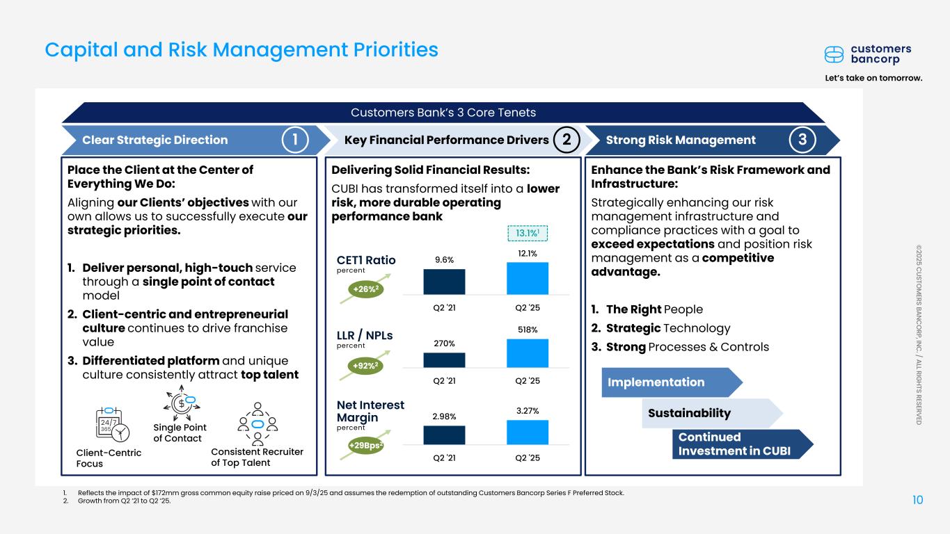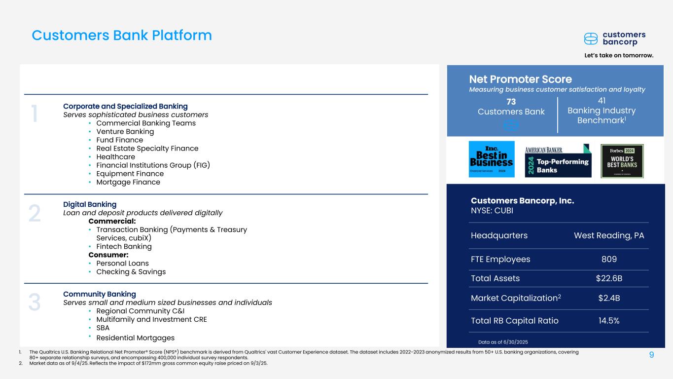 Let’s take on tomorrow. 9 © 2025 C USTO M ERS BANC O RP, INC . / ALL RIG HTS RESERVED Customers Bancorp, Inc. NYSE: CUBI Headquarters West Reading, PA FTE Employees 809 Total Assets $22.6B Market Capitalization2 $2.4B Total RB Capital Ratio 14.5% Data as of 6/30/2025 41 Banking Industry Benchmark1 73 Customers Bank Net Promoter Score Measuring business customer satisfaction and loyalty 1. The Qualtrics U.S. Banking Relational Net Promoter® Score (NPS®) benchmark is derived from Qualtrics' vast Customer Experience dataset. The dataset includes 2022-2023 anonymized results from 50+ U.S. banking organizations, covering 80+ separate relationship surveys, and encompassing 400,000 individual survey respondents. 2. Market data as of 9/4/25. Reflects the impact of $172mm gross common equity raise priced on 9/3/25. Corporate and Specialized Banking Serves sophisticated business customers • Commercial Banking Teams • Venture Banking • Fund Finance • Real Estate Specialty Finance • Healthcare • Financial Institutions Group (FIG) • Equipment Finance • Mortgage Finance Digital Banking Loan and deposit products delivered digitally Commercial: • Transaction Banking (Payments & Treasury Services, cubiX) • Fintech Banking Consumer: • Personal Loans • Checking & Savings Community Banking Serves small and medium sized businesses and individuals • Regional Community C&I • Multifamily and Investment CRE • SBA • Residential Mortgages 1 2 3 Customers Bank Platform