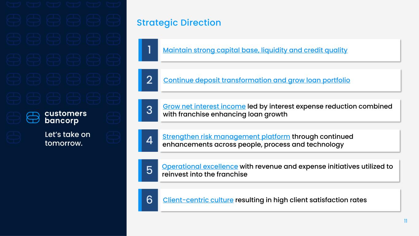 10 Let’s take on tomorrow. © 2025 C USTO M ERS BANC O RP, INC . / ALL RIG HTS RESERVED Capital and Risk Management Priorities Customers Bank’s 3 Core Tenets Delivering Solid Financial Results: CUBI has transformed itself into a lower risk, more durable operating performance bank Place the Client at the Center of Everything We Do: Aligning our Clients’ objectives with our own allows us to successfully execute our strategic priorities. 1. Deliver personal, high-touch service through a single point of contact model 2. Client-centric and entrepreneurial culture continues to drive franchise value 3. Differentiated platform and unique culture consistently attract top talent Enhance the Bank’s Risk Framework and Infrastructure: Strategically enhancing our risk management infrastructure and compliance practices with a goal to exceed expectations and position risk management as a competitive advantage. 1. The Right People 2. Strategic Technology 3. Strong Processes & Controls Clear Strategic Direction Key Financial Performance Drivers Strong Risk Management Implementation Sustainability Continued Investment in CUBI Single Point of Contact Client-Centric Focus CET1 Ratio percent +26%2 1 2 3 Consistent Recruiter of Top Talent LLR / NPLs percent Net Interest Margin percent +29Bps2 1. Reflects the impact of $172mm gross common equity raise priced on 9/3/25 and assumes the redemption of outstanding Customers Bancorp Series F Preferred Stock. 2. Growth from Q2 ’21 to Q2 ’25. +92%2 9.6% 12.1% Q2 '21 Q2 '25 270% 518% Q2 '21 Q2 '25 2.98% 3.27% Q2 '21 Q2 '25 13.1%1