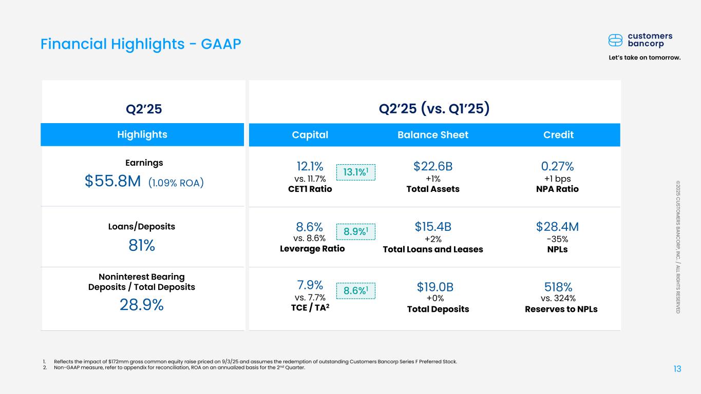 40 Let’s take on tomorrow. © 2025 C USTO M ERS BANC O RP, INC . / ALL RIG HTS RESERVED Reconciliation of Non-GAAP Measures – Unaudited (Contd.) Tangible Common Equity to Tangible Assets - Customers Bancorp (dollars in thousands except per share data) Q2 2025 Q2 2024 Q2 2023 Q2 2022 Q2 2021 GAAP total shareholders' equity $ 1,863,558 $ 1,746,865 $ 1,456,652 $ 1,353,390 $ 1,250,729 Reconciling items: Preferred stock (82,201) (137,794) (137,794) (137,794) (217,471) Goodwill and other intangibles (3,629) (3,629) (3,629) (3,629) (3,853) Tangible common equity $ 1,777,728 $ 1,605,442 $ 1,315,229 $ 1,211,967 $ 1,029,405 GAAP Total assets $ 22,550,800 $ 20,942,975 $ 22,028,565 $ 20,251,996 $ 19,635,108 Reconciling items: Goodwill and other intangibles (3,629) (3,629) (3,629) (3,629) (3,853) Tangible assets $ 22,547,171 $ 20,939,346 $ 22,024,936 $ 20,248,367 $ 19,631,255 Tangible common equity to tangible assets 7.9 % 7.7 % 6.0 % 6.0 % 5.2 %