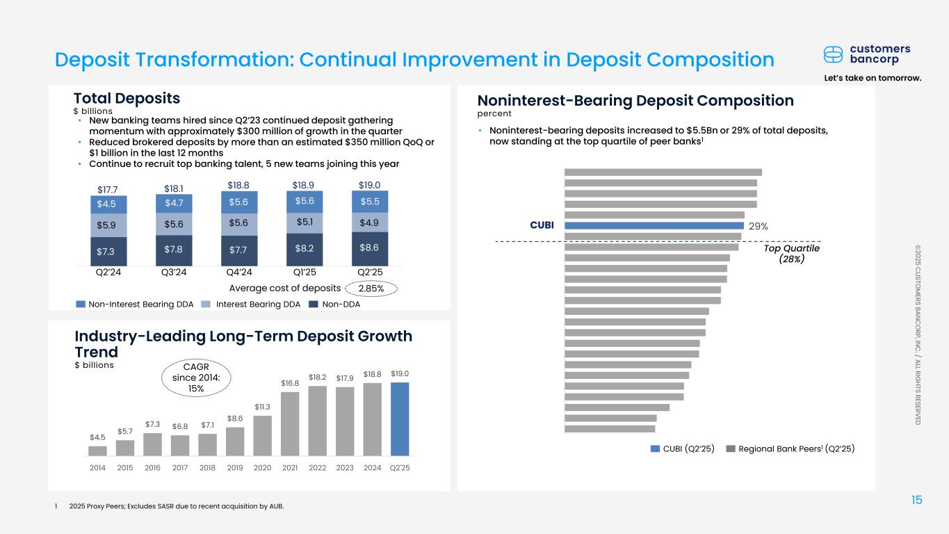 14 Let’s take on tomorrow. © 2025 C USTO M ERS BANC O RP, INC . / ALL RIG HTS RESERVED Q2’25 (vs. Q1’25) Capital Balance Sheet Credit 12.1% vs. 11.7% CET1 Ratio $22.6B +1% Total Assets 0.27% +1 bps NPA Ratio $15.4B +2% Total Loans and Leases $28.4M -35% NPLs 7.9% vs. 7.7% TCE / TA2 Highlights Q2’25 Total Deposits $19.0B +0% Reserves to NPLs 518% vs. 324%28.9% Noninterest Bearing Deposits / Total Deposits $58.1M (1.10% ROA)1,2 Core Earnings1,2 Loans/Deposits 81% Leverage Ratio 8.6% vs. 8.6% 1. Excludes loss on redemption of preferred stock of $1.9 million, pre-tax losses on investment securities of $1.8 million, loan program termination fees of $1.0 million and unrealized gain on loans held for sale of $0.3 million. 2. Non-GAAP measure, refer to appendix for reconciliation, ROA on an annualized basis for the 2nd Quarter. 3. Reflects the impact of $172mm gross common equity raise priced on 9/3/25 and assumes the redemption of outstanding Customers Bancorp Series F Preferred Stock. Financial Highlights – Core 13.1%3 8.9%3 8.6%3