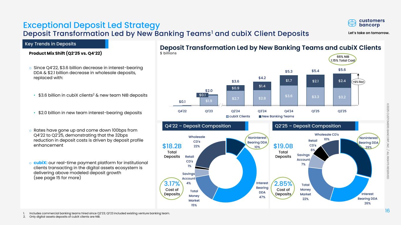 15 © 2025 C USTO M ERS BANC O RP, INC . / ALL RIG HTS RESERVED Let’s take on tomorrow. Kk $4.5 $5.7 $7.3 $6.8 $7.1 $8.6 $11.3 $16.8 $18.2 $17.9 $18.8 $19.0 2014 2015 2016 2017 2018 2019 2020 2021 2022 2023 2024 Q2'25 29%CUBI Total Deposits $ billions Average cost of deposits 2.85% $4.5 $5.9 $7.3 Q2’24 $4.7 $5.6 $7.8 Q3’24 $5.6 $5.6 $7.7 Q4’24 $5.6 $5.1 $8.2 Q1’25 $5.5 $4.9 $8.6 Q2’25 $17.7 $18.1 $18.8 $18.9 $19.0 Non-Interest Bearing DDA Interest Bearing DDA Non-DDA 1 2025 Proxy Peers; Excludes SASR due to recent acquisition by AUB. • New banking teams hired since Q2’23 continued deposit gathering momentum with approximately $300 million of growth in the quarter • Reduced brokered deposits by more than an estimated $350 million QoQ or $1 billion in the last 12 months • Continue to recruit top banking talent, 5 new teams joining this year Industry-Leading Long-Term Deposit Growth Trend $ billions Noninterest-Bearing Deposit Composition percent Top Quartile (28%) CUBI (Q2’25) Regional Bank Peers1 (Q2’25) CAGR since 2014: 15% • Noninterest-bearing deposits increased to $5.5Bn or 29% of total deposits, now standing at the top quartile of peer banks1 Deposit Transformation: Continual Improvement in Deposit Composition