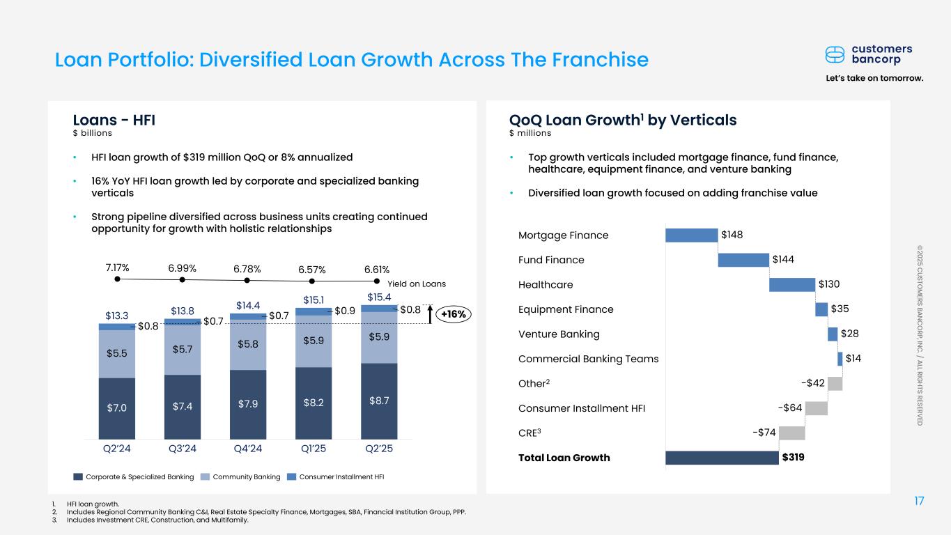 16 © 2025 C USTO M ERS BANC O RP, INC . / ALL RIG HTS RESERVED Let’s take on tomorrow. Kk $1.9 $2.7 $2.8 $3.6 $3.3 $3.2 $0.9 $1.4 $1.7 $2.1 $2.4 $0.1 $2.0 $3.6 $4.2 $5.3 $5.4 $5.6 Q4'22 Q1'23 Q2'24 Q3'24 Q4'24 Q1'25 Q2'25 cubiX Clients New Banking Teams 1. Includes commercial banking teams hired since Q2’23; Q1’23 included existing venture banking team. 2. Only digital assets deposits of cubiX clients are NIB. Deposit Transformation Led by New Banking Teams and cubiX Clients $ billions Key Trends in Deposits Product Mix Shift (Q2’25 vs. Q4’22) o Since Q4’22, $3.6 billion decrease in interest-bearing DDA & $2.1 billion decrease in wholesale deposits, replaced with: • $3.6 billion in cubiX clients2 & new team NIB deposits • $2.0 billion in new team interest-bearing deposits o Rates have gone up and come down 100bps from Q4’22 to Q2’25, demonstrating that the 32bps reduction in deposit costs is driven by deposit profile enhancement o cubiX: our real-time payment platform for institutional clients transacting in the digital assets ecosystem is delivering above modeled deposit growth (see page 15 for more) +$5.5bn $0.1 Exceptional Deposit Led Strategy Deposit Transformation Led by New Banking Teams1 and cubiX Client Deposits Q4’22 – Deposit Composition Q2’25 – Deposit Composition $18.2B Total Deposits 3.17% Cost of Deposits $19.0B Total Deposits 2.85% Cost of Deposits Noninterest Bearing DDA 10% Interest Bearing DDA 47% Total Money Market 15% Savings Account 4% Retail CD's 1% Wholesale CD's 22% Noninterest Bearing DDA 29% Interest Bearing DDA 26% Total Money Market 22% Savings Account 7% Retail CD's 6% Wholesale CD's 10% 66% NIB 1.15% Total Cost