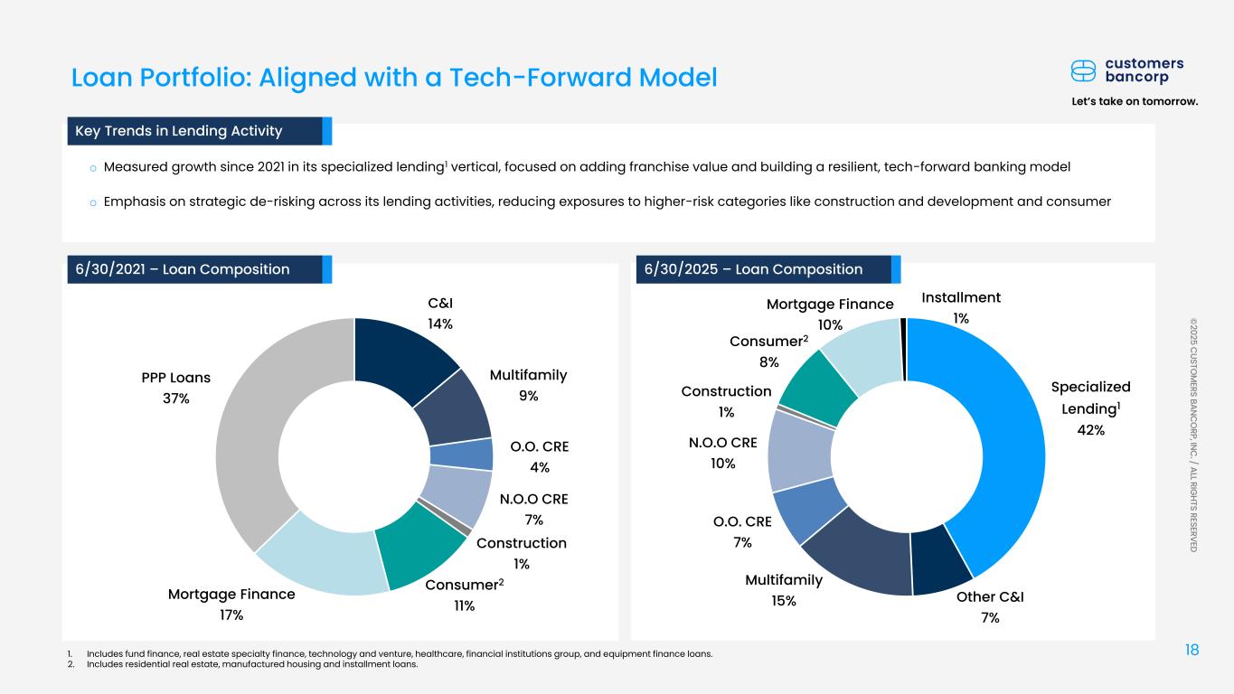 17 © 2025 C USTO M ERS BANC O RP, INC . / ALL RIG HTS RESERVED Let’s take on tomorrow. 7.17% 6.99% 6.78% 6.57% 6.61% Loans - HFI $ billions $0.7 $5.8 $7.9 Q4’24 $0.9 $5.9 $8.2 $0.8 $0.8 $5.5 $5.9 $8.7 Q2’25 $7.0 Q2’24 $0.7 $5.7 $7.4 Q3’24 $13.3 $13.8 $14.4 $15.1 $15.4 Q1’25 +16% Yield on Loans • HFI loan growth of $319 million QoQ or 8% annualized • 16% YoY HFI loan growth led by corporate and specialized banking verticals • Strong pipeline diversified across business units creating continued opportunity for growth with holistic relationships Corporate & Specialized Banking Community Banking Consumer Installment HFI 1. HFI loan growth. 2. Includes Regional Community Banking C&I, Real Estate Specialty Finance, Mortgages, SBA, Financial Institution Group, PPP. 3. Includes Investment CRE, Construction, and Multifamily. QoQ Loan Growth1 by Verticals $ millions Mortgage Finance Fund Finance Healthcare Equipment Finance Venture Banking Commercial Banking Teams Other2 Consumer Installment HFI CRE3 Total Loan Growth $148 $144 $130 $35 $28 $14 -$42 -$64 -$74 $319 • Top growth verticals included mortgage finance, fund finance, healthcare, equipment finance, and venture banking • Diversified loan growth focused on adding franchise value Loan Portfolio: Diversified Loan Growth Across The Franchise