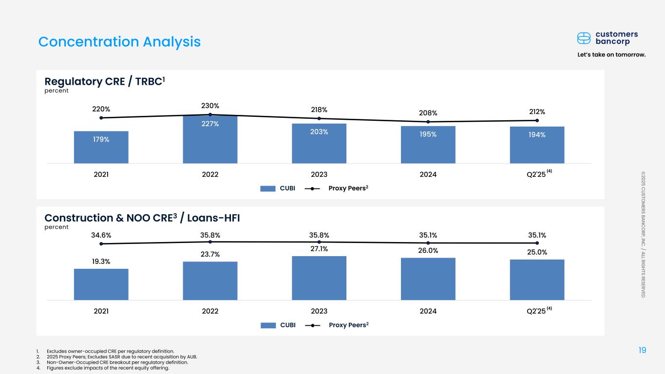 18 © 2025 C USTO M ERS BANC O RP, INC . / ALL RIG HTS RESERVED Let’s take on tomorrow. 1. Includes fund finance, real estate specialty finance, technology and venture, healthcare, financial institutions group, and equipment finance loans. 2. Includes residential real estate, manufactured housing and installment loans. Specialized Lending1 42% Other C&I 7% Multifamily 15% O.O. CRE 7% N.O.O CRE 10% Construction 1% Consumer2 8% Mortgage Finance 10% Installment 1% C&I 14% Multifamily 9% O.O. CRE 4% N.O.O CRE 7% Construction 1% Consumer2 11% Mortgage Finance 17% PPP Loans 37% 6/30/2021 – Loan Composition 6/30/2025 – Loan Composition Key Trends in Lending Activity o Measured growth since 2021 in its specialized lending1 vertical, focused on adding franchise value and building a resilient, tech-forward banking model o Emphasis on strategic de-risking across its lending activities, reducing exposures to higher-risk categories like construction and development and consumer Loan Portfolio: Aligned with a Tech-Forward Model