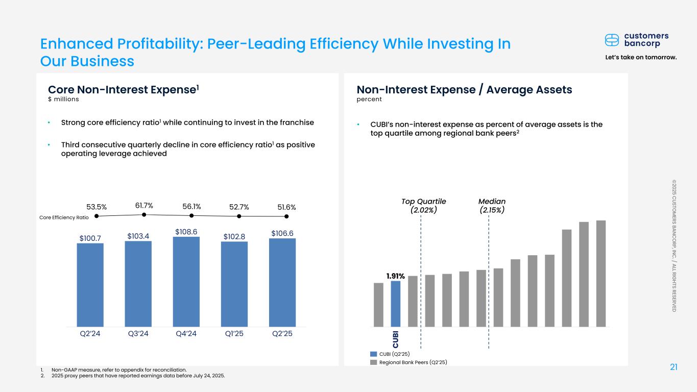 20 © 2025 C USTO M ERS BANC O RP, INC . / ALL RIG HTS RESERVED Let’s take on tomorrow. Net Interest Income & Net Interest Margin $ millions, percent • 29 Basis Points of NIM Expansion Since June 2021, with margins stabilizing at elevated levels • $2.0+ billion high quality deposit pipeline driving opportunity to remix less strategic funding • Robust loan pipeline to be converted to support interest income regardless of the rate environment Key Highlights $138.8 $164.9 $165.3 $167.7 $176.7 2.98% 3.27% Q2 '21 Q2 '22 Q2 '23 Q2 '24 Q2 '25 Net Interest Income NIM Enhanced Profitability: Continued Margin Expansion in the Quarter