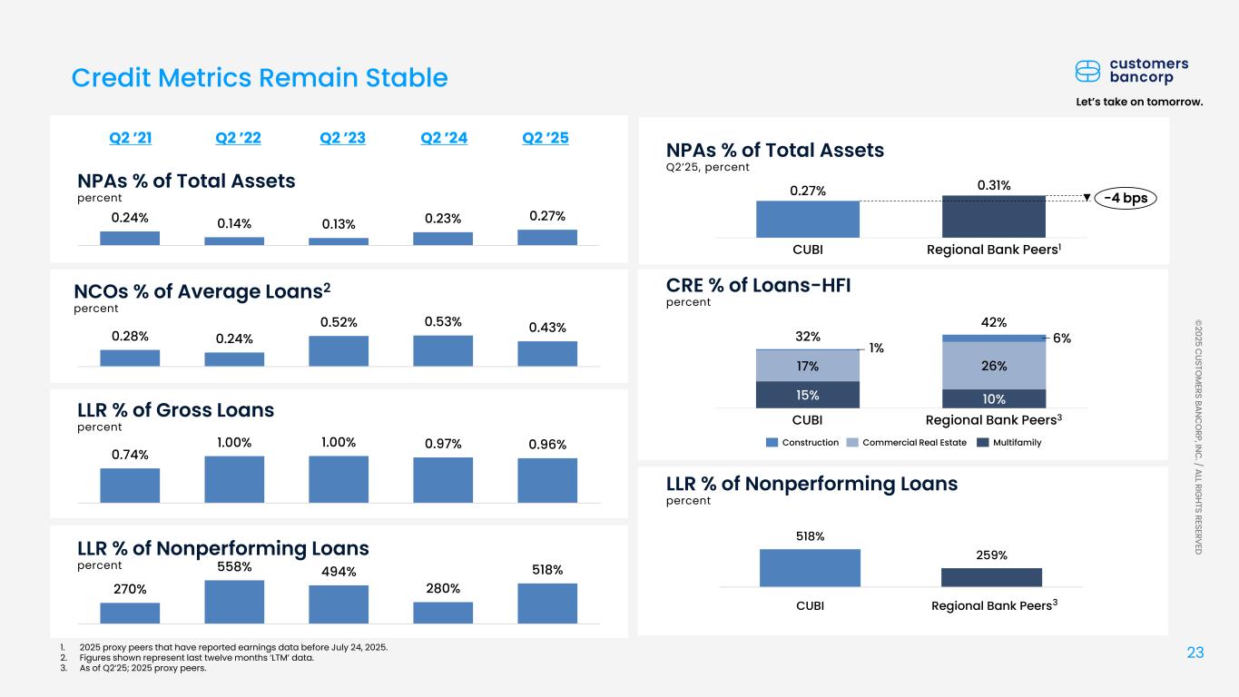 24 Let’s take on tomorrow. © 2025 C USTO M ERS BANC O RP, INC . / ALL RIG HTS RESERVED 1. Excludes mortgage finance and installment reported at fair value, loans held for sale. 2. Utilized Moody’s June 2025 baseline and adverse forecast scenario with qualitative adjustments for Q2’25 provision for credit losses. 3. Utilized Moody’s March 2025 baseline and adverse forecast scenario with qualitative adjustments for Q1’25 provision for credit losses. June 30, 2025 March 31, 2025 Amortized Cost(1) Allowance for Credit Losses Lifetime Loss Rate(2) Amortized Cost Allowance for Credit Losses Lifetime Loss Rate(3) ($ in thousands) Loans and Leases Receivable: Commercial: Commercial and Industrial, including Specialized Lending $ 7,581,855 $ 36,262 0.48 % $ 7,244,462 $ 30,584 0.42 % Multifamily 2,247,282 20,864 0.93 % 2,322,123 18,790 0.81 % Commercial Real Estate Owner Occupied 1,065,006 12,514 1.18 % 1,139,126 10,780 0.95 % Commercial Real Estate Non-Owner Occupied 1,497,385 20,679 1.38 % 1,438,906 18,058 1.25 % Construction 98,626 2,160 2.19 % 154,647 1,264 0.82 % Total Commercial Loans and Leases Receivable $ 12,490,154 $ 92,479 0.74 % $ 12,299,264 $ 79,476 0.65 % Consumer: Residential Real Estate $ 520,570 $ 6,331 1.22 % $ 496,772 $ 6,163 1.24 % Manufacturing Housing 30,287 3,721 12.29 % 31,775 3,800 11.96 % Installment 678,818 44,887 6.61 % 728,009 51,637 7.09 % Total Consumer Loans Receivable $ 1,229,675 $ 54,939 4.47 % $ 1,256,556 $ 61,600 4.90 % Total Loans and Leases Receivable $ 13,719,829 $ 147,418 1.07 % $ 13,555,820 $ 141,076 1.04 % Allowance for Credit Losses for Loans and Leases