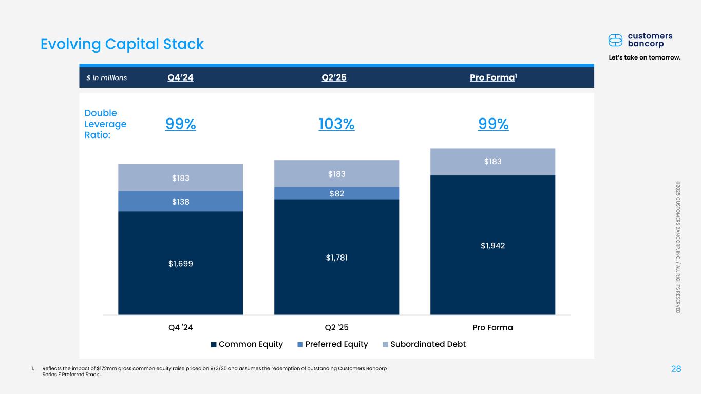 27 Let’s take on tomorrow. © 2025 C USTO M ERS BANC O RP, INC . / ALL RIG HTS RESERVED ` 5.2% 6.0% 6.0% 7.7% 7.9% ` ` ` Total Risk-Based Capital percent TCE/TA1 percent 1. Non-GAAP measure, refer to appendix for reconciliation. 2. Reflects the impact of $172mm gross common equity raise priced on 9/3/25 and assumes the redemption of outstanding Customers Bancorp Series F Preferred Stock. CET1 Risk-Based Capital percent Q2’21 Q2’22 Q2’23 Q2’24 Q2’25 Tier 1 Leverage percent Q2’21 Q2’22 Q2’23 Q2’24 Q2’25 Strong Capital Levels Provide Significant Flexibility 8.6% 9.6% 9.7% 10.3% 12.8% 12.0% 13.1% 8.4% 7.5% 7.5% 8.9% 8.6% 8.9% 13.3% 12.6% 13.2% 15.8% 14.5% 15.0% 2CUBI CUBI Pro Forma