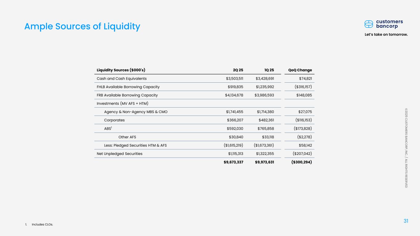 30 Let’s take on tomorrow. © 2025 C USTO M ERS BANC O RP, INC . / ALL RIG HTS RESERVED Immediately Available Liquidity $ billions $3.4 $1.2 $4.0 Q1’25 $3.5 $0.9 $4.1 Q2’25 $8.7 $8.6 Cash FHLB Available Committed Capacity FRB Available Committed Capacity 1. Uninsured deposits (estimate) of $7.4 billion to be reported on the Bank’s call report, less deposits of $1.6 billion collateralized by standby letters of credit from the FHLB and from our affiliates of $116.0 million. 2. 2025 proxy peers that have reported earnings data before July 24, 2025. • Immediately available liquidity to uninsured deposits1 of 150% • Total overall liquidity of $9.7 billion as of Q2’25 Loans-HFI to Deposits Q1’25, percent CUBI Regional Bank Peers2 81% 85% Borrowings % of Total Liabilities Q2’25, percent CUBI Regional Bank Peers2 7% 6% Robust Liquidity Position