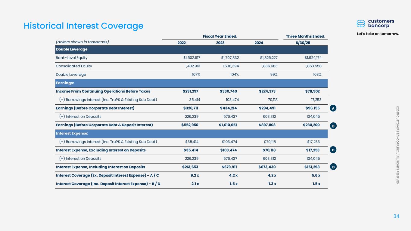 34 Let’s take on tomorrow. © 2025 C USTO M ERS BANC O RP, INC . / ALL RIG HTS RESERVED Fiscal Year Ended, Three Months Ended, (dollars shown in thousands) 2022 2023 2024 6/30/25 Double Leverage Bank-Level Equity $1,502,917 $1,707,832 $1,826,227 $1,924,174 Consolidated Equity 1,402,961 1,638,394 1,836,683 1,863,558 Double Leverage 107% 104% 99% 103% Earnings: Income From Continuing Operations Before Taxes $291,297 $330,740 $224,373 $78,902 (+) Borrowings Interest (inc. TruPS & Existing Sub Debt) 35,414 103,474 70,118 17,253 Earnings (Before Corporate Debt Interest) $326,711 $434,214 $294,491 $96,155 (+) Interest on Deposits 226,239 576,437 603,312 134,045 Earnings (Before Corporate Debt & Deposit Interest) $552,950 $1,010,651 $897,803 $230,200 Interest Expense: (+) Borrowings Interest (inc. TruPS & Existing Sub Debt) $35,414 $103,474 $70,118 $17,253 Interest Expense, Excluding Interest on Deposits $35,414 $103,474 $70,118 $17,253 (+) Interest on Deposits 226,239 576,437 603,312 134,045 Interest Expense, Including Interest on Deposits $261,653 $679,911 $673,430 $151,298 Interest Coverage (Ex. Deposit Interest Expense) - A / C 9.2 x 4.2 x 4.2 x 5.6 x Interest Coverage (Inc. Deposit Interest Expense) - B / D 2.1 x 1.5 x 1.3 x 1.5 x A B C D (2) (2) Historical Interest Coverage