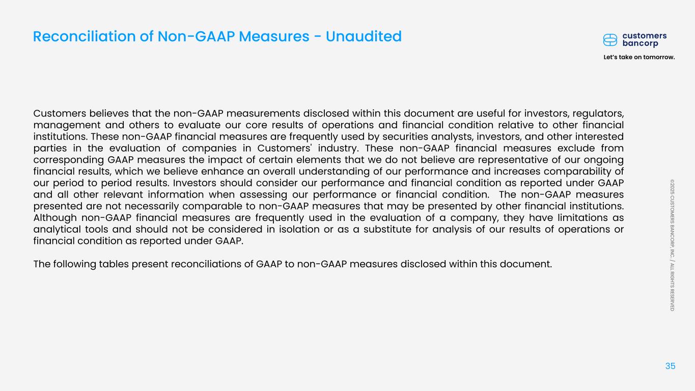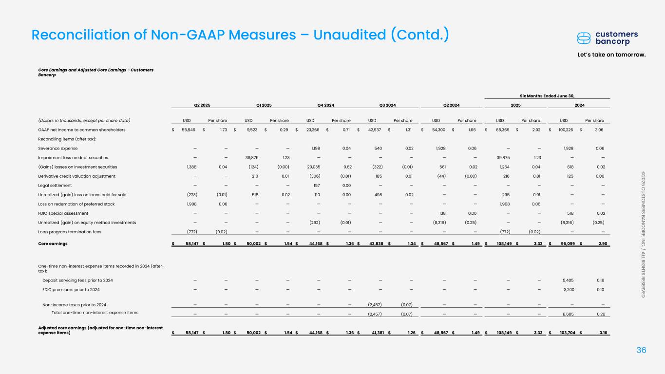 35 Let’s take on tomorrow. © 2025 C USTO M ERS BANC O RP, INC . / ALL RIG HTS RESERVED Customers believes that the non-GAAP measurements disclosed within this document are useful for investors, regulators, management and others to evaluate our core results of operations and financial condition relative to other financial institutions. These non-GAAP financial measures are frequently used by securities analysts, investors, and other interested parties in the evaluation of companies in Customers' industry. These non-GAAP financial measures exclude from corresponding GAAP measures the impact of certain elements that we do not believe are representative of our ongoing financial results, which we believe enhance an overall understanding of our performance and increases comparability of our period to period results. Investors should consider our performance and financial condition as reported under GAAP and all other relevant information when assessing our performance or financial condition. The non-GAAP measures presented are not necessarily comparable to non-GAAP measures that may be presented by other financial institutions. Although non-GAAP financial measures are frequently used in the evaluation of a company, they have limitations as analytical tools and should not be considered in isolation or as a substitute for analysis of our results of operations or financial condition as reported under GAAP. The following tables present reconciliations of GAAP to non-GAAP measures disclosed within this document. Reconciliation of Non-GAAP Measures - Unaudited