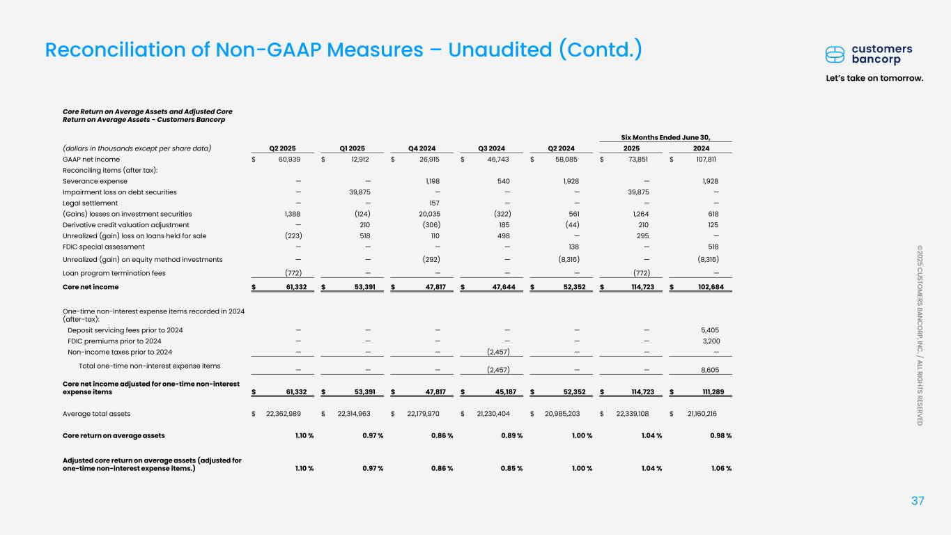 36 Let’s take on tomorrow. © 2025 C USTO M ERS BANC O RP, INC . / ALL RIG HTS RESERVED Reconciliation of Non-GAAP Measures – Unaudited (Contd.) Core Earnings and Adjusted Core Earnings - Customers Bancorp Six Months Ended June 30, Q2 2025 Q1 2025 Q4 2024 Q3 2024 Q2 2024 2025 2024 (dollars in thousands, except per share data) USD Per share USD Per share USD Per share USD Per share USD Per share USD Per share USD Per share GAAP net income to common shareholders $ 55,846 $ 1.73 $ 9,523 $ 0.29 $ 23,266 $ 0.71 $ 42,937 $ 1.31 $ 54,300 $ 1.66 $ 65,369 $ 2.02 $ 100,226 $ 3.06 Reconciling items (after tax): Severance expense — — — — 1,198 0.04 540 0.02 1,928 0.06 — — 1,928 0.06 Impairment loss on debt securities — — 39,875 1.23 — — — — — — 39,875 1.23 — — (Gains) losses on investment securities 1,388 0.04 (124) (0.00) 20,035 0.62 (322) (0.01) 561 0.02 1,264 0.04 618 0.02 Derivative credit valuation adjustment — — 210 0.01 (306) (0.01) 185 0.01 (44) (0.00) 210 0.01 125 0.00 Legal settlement — — — — 157 0.00 — — — — — — — — Unrealized (gain) loss on loans held for sale (223) (0.01) 518 0.02 110 0.00 498 0.02 — — 295 0.01 — — Loss on redemption of preferred stock 1,908 0.06 — — — — — — — — 1,908 0.06 — — FDIC special assessment — — — — — — — — 138 0.00 — — 518 0.02 Unrealized (gain) on equity method investments — — — — (292) (0.01) — — (8,316) (0.25) — — (8,316) (0.25) Loan program termination fees (772) (0.02) — — — — — — — — (772) (0.02) — — Core earnings $ 58,147 $ 1.80 $ 50,002 $ 1.54 $ 44,168 $ 1.36 $ 43,838 $ 1.34 $ 48,567 $ 1.49 $ 108,149 $ 3.33 $ 95,099 $ 2.90 One-time non-interest expense items recorded in 2024 (after- tax): Deposit servicing fees prior to 2024 — — — — — — — — — — — — 5,405 0.16 FDIC premiums prior to 2024 — — — — — — — — — — — — 3,200 0.10 Non-income taxes prior to 2024 — — — — — — (2,457) (0.07) — — — — — — Total one-time non-interest expense items — — — — — — (2,457) (0.07) — — — — 8,605 0.26 Adjusted core earnings (adjusted for one-time non-interest expense items) $ 58,147 $ 1.80 $ 50,002 $ 1.54 $ 44,168 $ 1.36 $ 41,381 $ 1.26 $ 48,567 $ 1.49 $ 108,149 $ 3.33 $ 103,704 $ 3.16