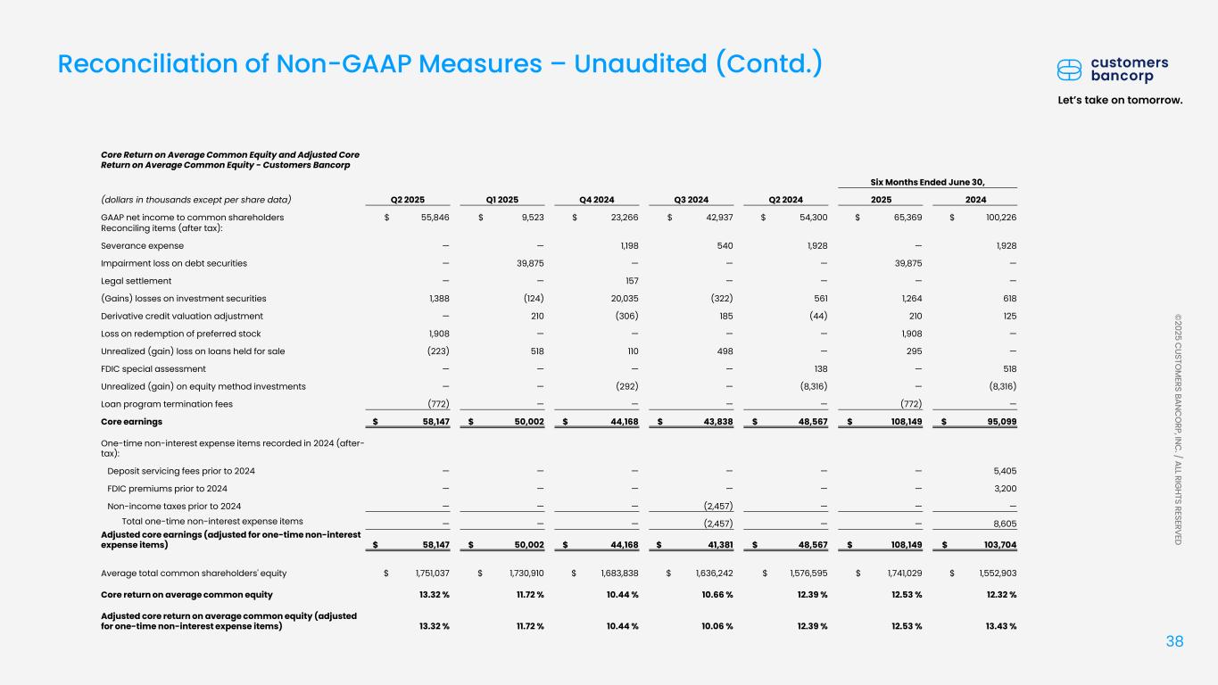 37 Let’s take on tomorrow. © 2025 C USTO M ERS BANC O RP, INC . / ALL RIG HTS RESERVED Reconciliation of Non-GAAP Measures – Unaudited (Contd.) Core Return on Average Assets and Adjusted Core Return on Average Assets - Customers Bancorp Six Months Ended June 30, (dollars in thousands except per share data) Q2 2025 Q1 2025 Q4 2024 Q3 2024 Q2 2024 2025 2024 GAAP net income $ 60,939 $ 12,912 $ 26,915 $ 46,743 $ 58,085 $ 73,851 $ 107,811 Reconciling items (after tax): Severance expense — — 1,198 540 1,928 — 1,928 Impairment loss on debt securities — 39,875 — — — 39,875 — Legal settlement — — 157 — — — — (Gains) losses on investment securities 1,388 (124) 20,035 (322) 561 1,264 618 Derivative credit valuation adjustment — 210 (306) 185 (44) 210 125 Unrealized (gain) loss on loans held for sale (223) 518 110 498 — 295 — FDIC special assessment — — — — 138 — 518 Unrealized (gain) on equity method investments — — (292) — (8,316) — (8,316) Loan program termination fees (772) — — — — (772) — Core net income $ 61,332 $ 53,391 $ 47,817 $ 47,644 $ 52,352 $ 114,723 $ 102,684 One-time non-interest expense items recorded in 2024 (after-tax): Deposit servicing fees prior to 2024 — — — — — — 5,405 FDIC premiums prior to 2024 — — — — — — 3,200 Non-income taxes prior to 2024 — — — (2,457) — — — Total one-time non-interest expense items — — — (2,457) — — 8,605 Core net income adjusted for one-time non-interest expense items $ 61,332 $ 53,391 $ 47,817 $ 45,187 $ 52,352 $ 114,723 $ 111,289 Average total assets $ 22,362,989 $ 22,314,963 $ 22,179,970 $ 21,230,404 $ 20,985,203 $ 22,339,108 $ 21,160,216 Core return on average assets 1.10 % 0.97 % 0.86 % 0.89 % 1.00 % 1.04 % 0.98 % Adjusted core return on average assets (adjusted for one-time non-interest expense items.) 1.10 % 0.97 % 0.86 % 0.85 % 1.00 % 1.04 % 1.06 %