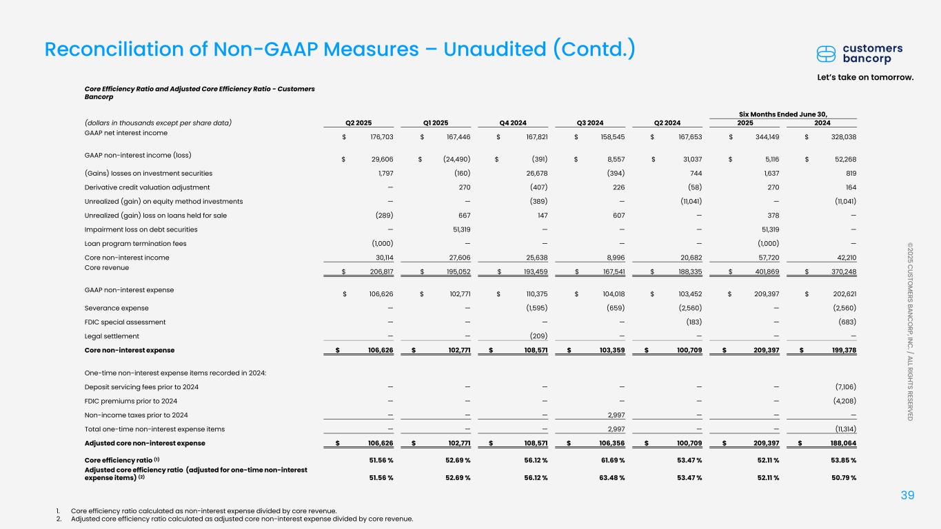 38 Let’s take on tomorrow. © 2025 C USTO M ERS BANC O RP, INC . / ALL RIG HTS RESERVED Reconciliation of Non-GAAP Measures – Unaudited (Contd.) Core Return on Average Common Equity and Adjusted Core Return on Average Common Equity - Customers Bancorp Six Months Ended June 30, (dollars in thousands except per share data) Q2 2025 Q1 2025 Q4 2024 Q3 2024 Q2 2024 2025 2024 GAAP net income to common shareholders $ 55,846 $ 9,523 $ 23,266 $ 42,937 $ 54,300 $ 65,369 $ 100,226 Reconciling items (after tax): Severance expense — — 1,198 540 1,928 — 1,928 Impairment loss on debt securities — 39,875 — — — 39,875 — Legal settlement — — 157 — — — — (Gains) losses on investment securities 1,388 (124) 20,035 (322) 561 1,264 618 Derivative credit valuation adjustment — 210 (306) 185 (44) 210 125 Loss on redemption of preferred stock 1,908 — — — — 1,908 — Unrealized (gain) loss on loans held for sale (223) 518 110 498 — 295 — FDIC special assessment — — — — 138 — 518 Unrealized (gain) on equity method investments — — (292) — (8,316) — (8,316) Loan program termination fees (772) — — — — (772) — Core earnings $ 58,147 $ 50,002 $ 44,168 $ 43,838 $ 48,567 $ 108,149 $ 95,099 One-time non-interest expense items recorded in 2024 (after- tax): Deposit servicing fees prior to 2024 — — — — — — 5,405 FDIC premiums prior to 2024 — — — — — — 3,200 Non-income taxes prior to 2024 — — — (2,457) — — — Total one-time non-interest expense items — — — (2,457) — — 8,605 Adjusted core earnings (adjusted for one-time non-interest expense items) $ 58,147 $ 50,002 $ 44,168 $ 41,381 $ 48,567 $ 108,149 $ 103,704 Average total common shareholders' equity $ 1,751,037 $ 1,730,910 $ 1,683,838 $ 1,636,242 $ 1,576,595 $ 1,741,029 $ 1,552,903 Core return on average common equity 13.32 % 11.72 % 10.44 % 10.66 % 12.39 % 12.53 % 12.32 % Adjusted core return on average common equity (adjusted for one-time non-interest expense items) 13.32 % 11.72 % 10.44 % 10.06 % 12.39 % 12.53 % 13.43 %