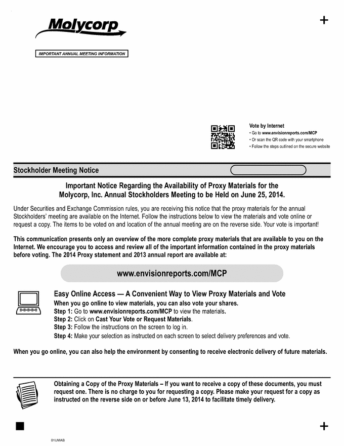 www.envisionreports.com/MCP Step 1: Go to www.envisionreports.com/MCP to view the materials. Step 2: Click on Cast Your Vote or Request Materials. Step 3: Follow the instructions on the screen to log in. Vote by Internet • Go to www.envisionreports.com/MCP • Or scan the QR code with your smartphone • Follow the steps outlined on the secure website Stockholder Meeting Notice 01UMAB + + Important Notice Regarding the Availability of Proxy Materials for the Molycorp, Inc. Annual Stockholders Meeting to be Held on June 25, 2014. Under Securities and Exchange Commission rules, you are receiving this notice that the proxy materials for the annual Stockholders’ meeting are available on the Internet. Follow the instructions below to view the materials and vote online or request a copy. The items to be voted on and location of the annual meeting are on the reverse side. Your vote is important! This communication presents only an overview of the more complete proxy materials that are available to you on the Internet. We encourage you to access and review all of the important information contained in the proxy materials before voting. The 2014 Proxy statement and 2013 annual report are available at: Easy Online Access — A Convenient Way to View Proxy Materials and Vote When you go online to view materials, you can also vote your shares. Step 4: Make your selection as instructed on each screen to select delivery preferences and vote. When you go online, you can also help the environment by consenting to receive electronic delivery of future materials. Obtaining a Copy of the Proxy Materials – If you want to receive a copy of these documents, you must request one. There is no charge to you for requesting a copy. Please make your request for a copy as instructed on the reverse side on or before June 13, 2014 to facilitate timely delivery. . IMPORTANT ANNUAL MEETING INFORMATION |