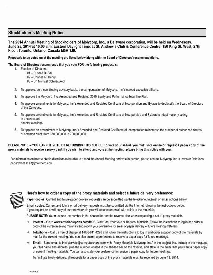 For information on how to obtain directions to be able to attend the Annual Meeting and vote in person, please contact Molycorp, Inc.’s Investor Relations department at IR@molycorp.com. Here’s how to order a copy of the proxy materials and select a future delivery preference: Paper copies: Current and future paper delivery requests can be submitted via the telephone, Internet or email options below. Email copies: Current and future email delivery requests must be submitted via the Internet following the instructions below. If you request an email copy of current materials you will receive an email with a link to the materials. PLEASE NOTE: You must use the number in the shaded bar on the reverse side when requesting a set of proxy materials. g Internet – Go to www.envisionreports.com/MCP. Click Cast Your Vote or Request Materials. Follow the instructions to log in and order a copy of the current meeting materials and submit your preference for email or paper delivery of future meeting materials. g Telephone – Call us free of charge at 1-866-641-4276 and follow the instructions to log in and order a paper copy of the materials by mail for the current meeting. You can also submit a preference to receive a paper copy for future meetings. g Email – Send email to investorvote@computershare.com with “Proxy Materials Molycorp, Inc.” in the subject line. Include in the message your full name and address, plus the number located in the shaded bar on the reverse, and state in the email that you want a paper copy of current meeting materials. You can also state your preference to receive a paper copy for future meetings. To facilitate timely delivery, all requests for a paper copy of the proxy materials must be received by June 13, 2014. . Stockholder’s Meeting Notice The 2014 Annual Meeting of Stockholders of Molycorp, Inc., a Delaware corporation, will be held on Wednesday, June 25, 2014 at 10:00 a.m. Eastern Daylight Time, at St. Andrew's Club & Conference Centre, 150 King St. West, 27th Floor, Toronto, Ontario, Canada M5H 1J9. Proposals to be voted on at the meeting are listed below along with the Board of Directors’ recommendations. The Board of Directors recommends that you vote FOR the following proposals: 1. Election of Directors 01 – Russell D. Ball 02 – Charles R. Henry 03 – Dr. Michael Schwarzkopf 2. To approve, on a non-binding advisory basis, the compensation of Molycorp, Inc.’s named executive officers. 3. To approve the Molycorp, Inc. Amended and Restated 2010 Equity and Performance Incentive Plan. 4. To approve amendments to Molycorp, Inc.’s Amended and Restated Certificate of Incorporation and Bylaws to declassify the Board of Directors of the Company. 5. To approve amendments to Molycorp, Inc.’s Amended and Restated Certificate of Incorporated and Bylaws to adopt majority voting in uncontested director elections. 6. To approve an amendment to Molycorp, Inc.’s Amended and Restated Certificate of Incorporation to increase the number of authorized shares of common stock from 350,000,000 to 700,000,000. PLEASE NOTE – YOU CANNOT VOTE BY RETURNING THIS NOTICE. To vote your shares you must vote online or request a paper copy of the proxy materials to receive a proxy card. If you wish to attend and vote at the meeting, please bring this notice with you. 01UMAB |