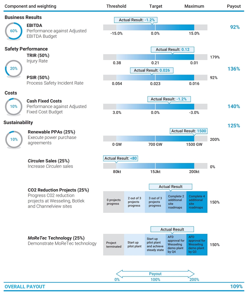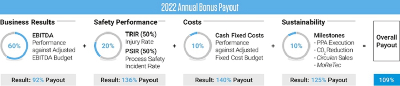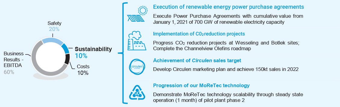 To support our long-term goals, in 2022 we focused on becoming a leader in circular and low carbon solutions. We implemented initiatives to build up our global circular feedstock supply, increase our Circulen product sales volumes, and add to our renewable power capacity.