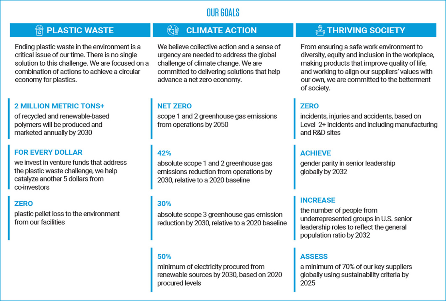 This past December, we stepped up our climate goals and announced more ambitious GHG reduction targets for 2030. We increased our scope 1 and 2 reduction targets from 30% to 42%. In addition, we established a new goal to reduce scope 3 emissions 30% by 2030. We continue to strive towards net zero scope 1 and 2 emissions from global operations by 2050. We also continue to focus on our ambition to produce and market at least 2 million metric tons of recycled and renewable-based polymers annually by 2030, including through our Circular and Low Carbon Solutions business.