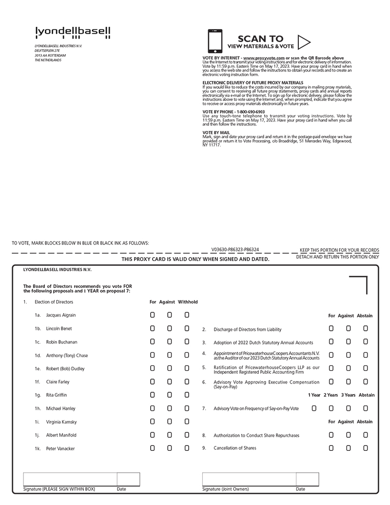 The statements in this proxy statement relating to matters that are not historical facts are forward-looking statements. These forward-looking statements are based upon assumptions of management of LyondellBasell which are believed to be reasonable at the time made and are subject to significant risks and uncertainties. When used in this proxy statement, the words “estimate,” “believe,” “continue,” “could,” “intend,” “may,” “plan,” “potential,” “predict,” “should,” “will,” “expect,” and similar expressions are intended to identify forward-looking statements, although not all forward-looking statements contain such identifying words. Actual results could differ materially based on factors including, but not limited to, our ability to attract and retain a highly skilled and diverse workforce; actions taken by customers, suppliers, regulators, and others in response to increasing concerns about the environmental impact of plastic in the environment or other general sustainability initiatives; our ability to meet our sustainability goals, including the ability to operate safely, increase production of recycled and renewable-based polymers, and reduce our emissions and achieve net zero emissions by the time set in our goals; our ability to procure energy from renewable and low carbon sources; water scarcity and quality; the pace of climate change and legal or regulatory responses thereto; and technological developments, and our ability to develop new products and process technologies. Additional factors that could cause results to differ materially from those described in the forward-looking statements can be found in the “Risk Factors” sections of our Form 10-K for the year ended December 31, 2022, which can be found at www.LyondellBasell.com on the Investor Relations page and on the Securities and Exchange Commission’s website at www.sec.gov. There is no assurance that any of the actions, events or results of the forward-looking statements will occur, or if any of them do, what impact they will have on our results of operations or financial condition. Forward-looking statements speak only as of the date they were made and are based on the estimates and opinions of management of LyondellBasell at the time the statements are made. LyondellBasell does not assume any obligation to update forward-looking statements should circumstances or management’s estimates or opinions change, except as required by law.