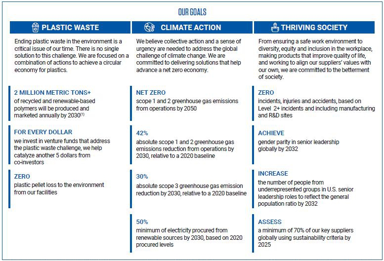 Throughout the year, our CLCS business built strong foundations to secure feedstock supply, expand our recycling footprint, and develop scalable recycling technologies to support the reduction of plastic waste in the environment. In addition, we formed joint ventures to build plastics recycling infrastructure in Europe, Asia, and North America. We also achieved nearly 90% of our goal to procure half of our electricity from renewable sources and issued our inaugural green bond to help advance LYB’s long-term sustainability goals.