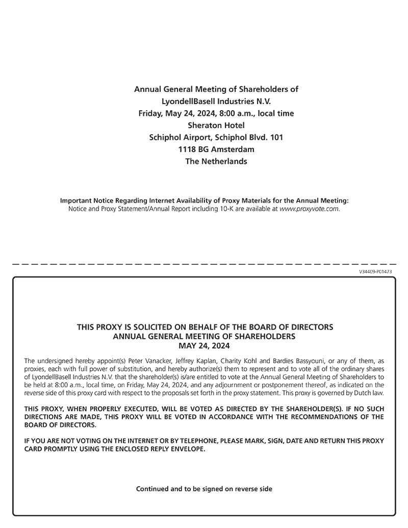 If you would like to attend the Annual Meeting, you must inform us in writing of your intention to do so on or before May 17, 2024, one week prior to the date of the meeting. The notice may be emailed to CorporateSecretary@LyondellBasell.com. Additional information regarding the availability of and procedures for in person attendance at the Annual Meeting will be provided to shareholders who provide timely notice of intent to attend and proper evidence of their ownership of LYB shares as of the Record Date. Admittance of shareholders to the Annual Meeting will be governed by Dutch law.