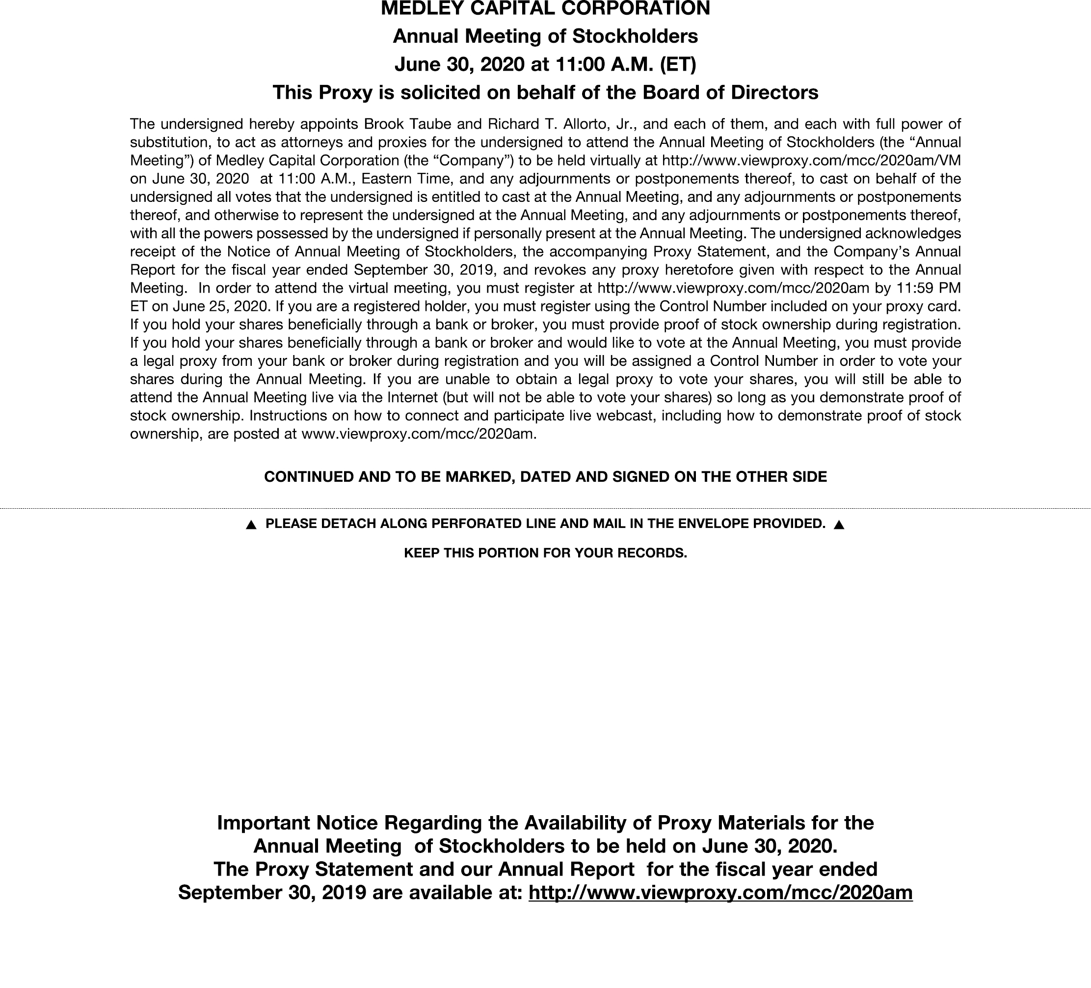 The Notice of Annual Meeting, Proxy Statement and Annual Report on Form 10-K for our fiscal year ended September 30, 2019, are available at www.medleycapitalcorp.com. Instead of receiving future copies of the proxy statement and Annual Report on Form 10-K by mail, you may, by following the applicable procedures described below, elect to receive these documents electronically, in which case you will receive an e-mail with a link to these documents.