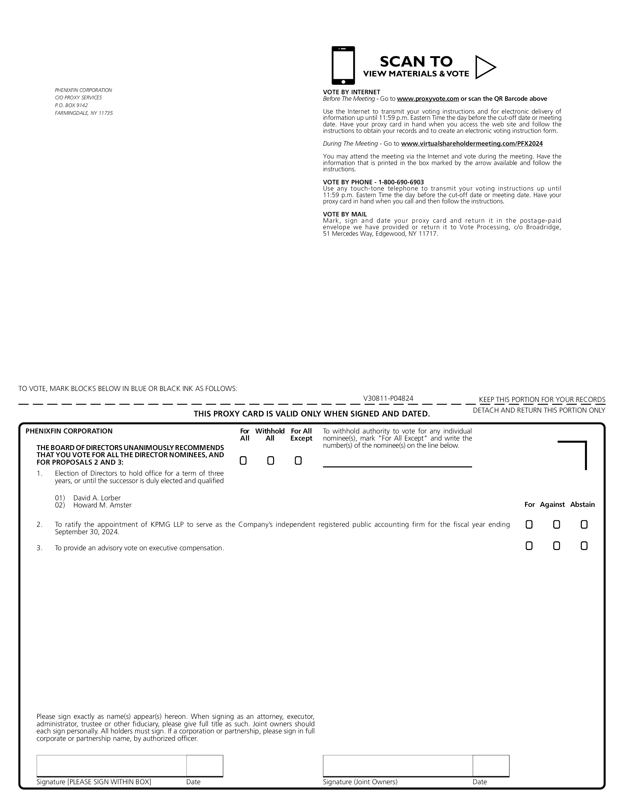 Signature [PLEASE SIGN WITHIN BOX] Date Signature (Joint Owners) Date TO VOTE, MARK BLOCKS BELOW IN BLUE OR BLACK INK AS FOLLOWS: KEEP THIS PORTION FOR YOUR RECORDS THIS PROXY CARD IS VALID ONLY WHEN SIGNED AND DATED. DETACH AND RETURN THIS PORTION ONLY V30811-P04824 For Against Abstain PHENIXFIN CORPORATION C/O PROXY SERVICES P.O. BOX 9142 FARMINGDALE, NY 11735 VOTE BY INTERNET Before The Meeting - Go to www.proxyvote.com or scan the QR Barcode above Use the Internet to transmit your voting instructions and for electronic delivery of information up until 11:59 p.m. Eastern Time the day before the cut-off date or meeting date. Have your proxy card in hand when you access the web site and follow the instructions to obtain your records and to create an electronic voting instruction form. During The Meeting - Go to www.virtualshareholdermeeting.com/PFX2024 You may attend the meeting via the Internet and vote during the meeting. Have the information that is printed in the box marked by the arrow available and follow the instructions. VOTE BY PHONE - 1-800-690-6903 Use any touch-tone telephone to transmit your voting instructions up until 11:59 p.m. Eastern Time the day before the cut-off date or meeting date. Have your proxy card in hand when you call and then follow the instructions. VOTE BY MAIL Mark, sign and date your proxy card and return it in the postage-paid envelope we have provided or return it to Vote Processing, c/o Broadridge, 51 Mercedes Way, Edgewood, NY 11717. SCAN TO VIEW MATERIALS &VOTE Please sign exactly as name(s) appear(s) hereon. When signing as an attorney, executor, administrator, trustee or other fiduciary, please give full title as such. Joint owners should each sign personally. All holders must sign. If a corporation or partnership, please sign in full corporate or partnership name, by authorized officer. PHENIXFIN CORPORATION 1. Election of Directors to hold office for a term of three years, or until the successor is duly elected and qualified THE BOARDOFDIRECTORSUNANIMOUSLYRECOMMENDS THAT YOU VOTE FOR ALL THE DIRECTOR NOMINEES, AND FOR PROPOSALS 2 AND 3: 2. To ratify the appointment of KPMG LLP to serve as the Company’s independent registered public accounting firm for the fiscal year ending September 30, 2024. 01) David A. Lorber 02) Howard M. Amster 3. To provide an advisory vote on executive compensation. For All Withhold All For All Except To withhold authority to vote for any individual nominee(s), mark “For All Except” and write the number(s) of the nominee(s) on the line below.