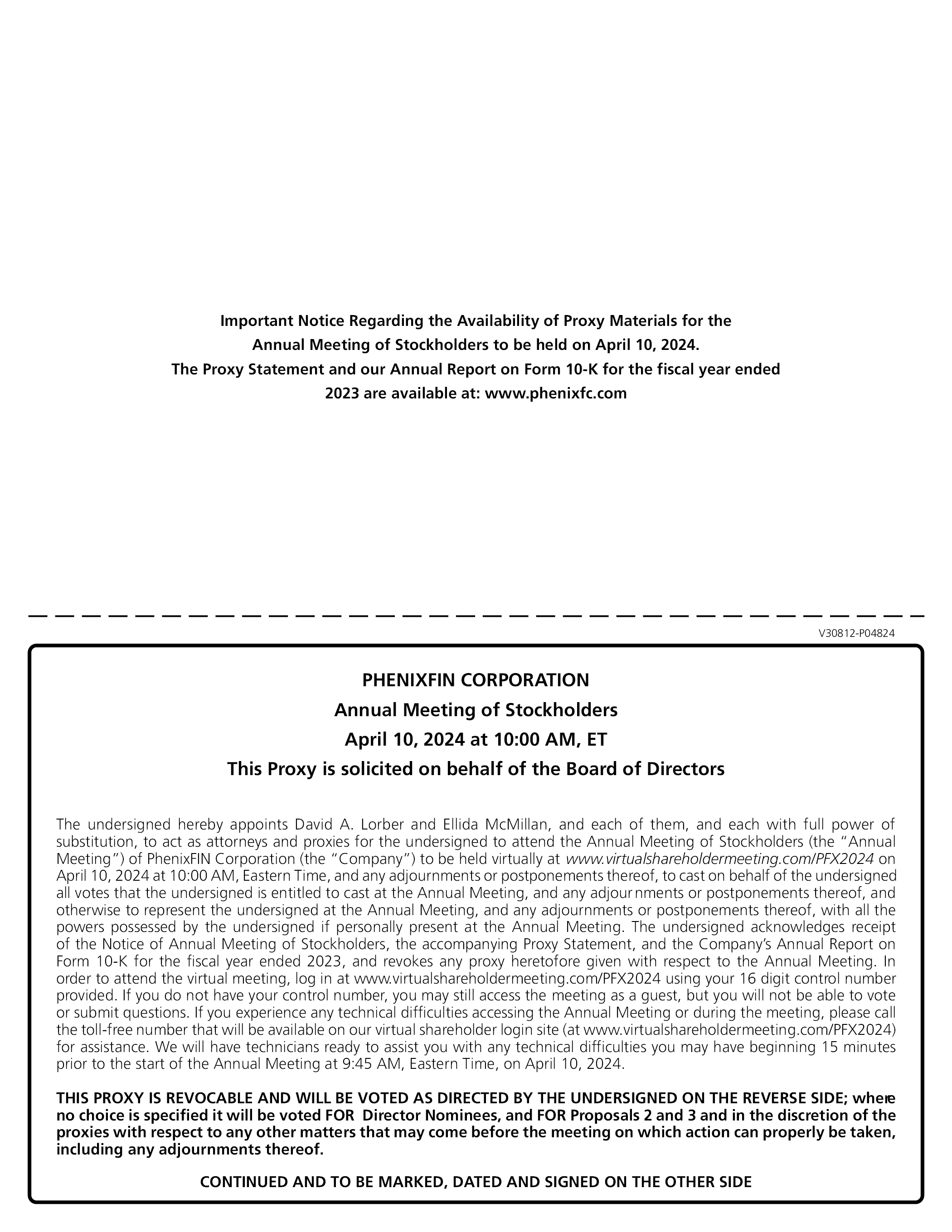 V30812-P04824 Important Notice Regarding the Availability of Proxy Materials for the Annual Meeting of Stockholders to be held on April 10, 2024. The Proxy Statement and our Annual Report on Form 10-K for the fiscal year ended 2023 are available at: www.phenixfc.com PHENIXFIN CORPORATION Annual Meeting of Stockholders April 10, 2024 at 10:00 AM, ET This Proxy is solicited on behalf of the Board of Directors The undersigned hereby appoints David A. Lorber and Ellida McMillan, and each of them, and each with full power of substitution, to act as attorneys and proxies for the undersigned to attend the Annual Meeting of Stockholders (the “Annual Meeting”) of PhenixFIN Corporation (the “Company”) to be held virtually at www.virtualshareholdermeeting.com/PFX2024 on April 10, 2024 at 10:00 AM, Eastern Time, and any adjournments or postponements thereof, to cast on behalf of the undersigned all votes that the undersigned is entitled to cast at the Annual Meeting, and any adjournments or postponements thereof, and otherwise to represent the undersigned at the Annual Meeting, and any adjournments or postponements thereof, with all the powers possessed by the undersigned if personally present at the Annual Meeting. The undersigned acknowledges receipt of the Notice of Annual Meeting of Stockholders, the accompanying Proxy Statement, and the Company’s Annual Report on Form 10-K for the fiscal year ended 2023, and revokes any proxy heretofore given with respect to the Annual Meeting. In order to attend the virtual meeting, log in at www.virtualshareholdermeeting.com/PFX2024 using your 16 digit control number provided. If you do not have your control number, you may still access the meeting as a guest, but you will not be able to vote or submit questions. If you experience any technical difficulties accessing the Annual Meeting or during the meeting, please call the toll-free number that will be available on our virtual shareholder login site (at www.virtualshareholdermeeting.com/PFX2024) for assistance. We will have technicians ready to assist you with any technical difficulties you may have beginning 15 minutes prior to the start of the Annual Meeting at 9:45 AM, Eastern Time, on April 10, 2024. THIS PROXY IS REVOCABLE AND WILL BE VOTED AS DIRECTED BY THE UNDERSIGNED ON THE REVERSE SIDE; where no choice is specified it will be voted FOR Director Nominees, and FOR Proposals 2 and 3 and in the discretion of the proxies with respect to any other matters that may come before the meeting on which action can properly be taken, including any adjournments thereof. CONTINUED AND TO BE MARKED, DATED AND SIGNED ON THE OTHER SIDE