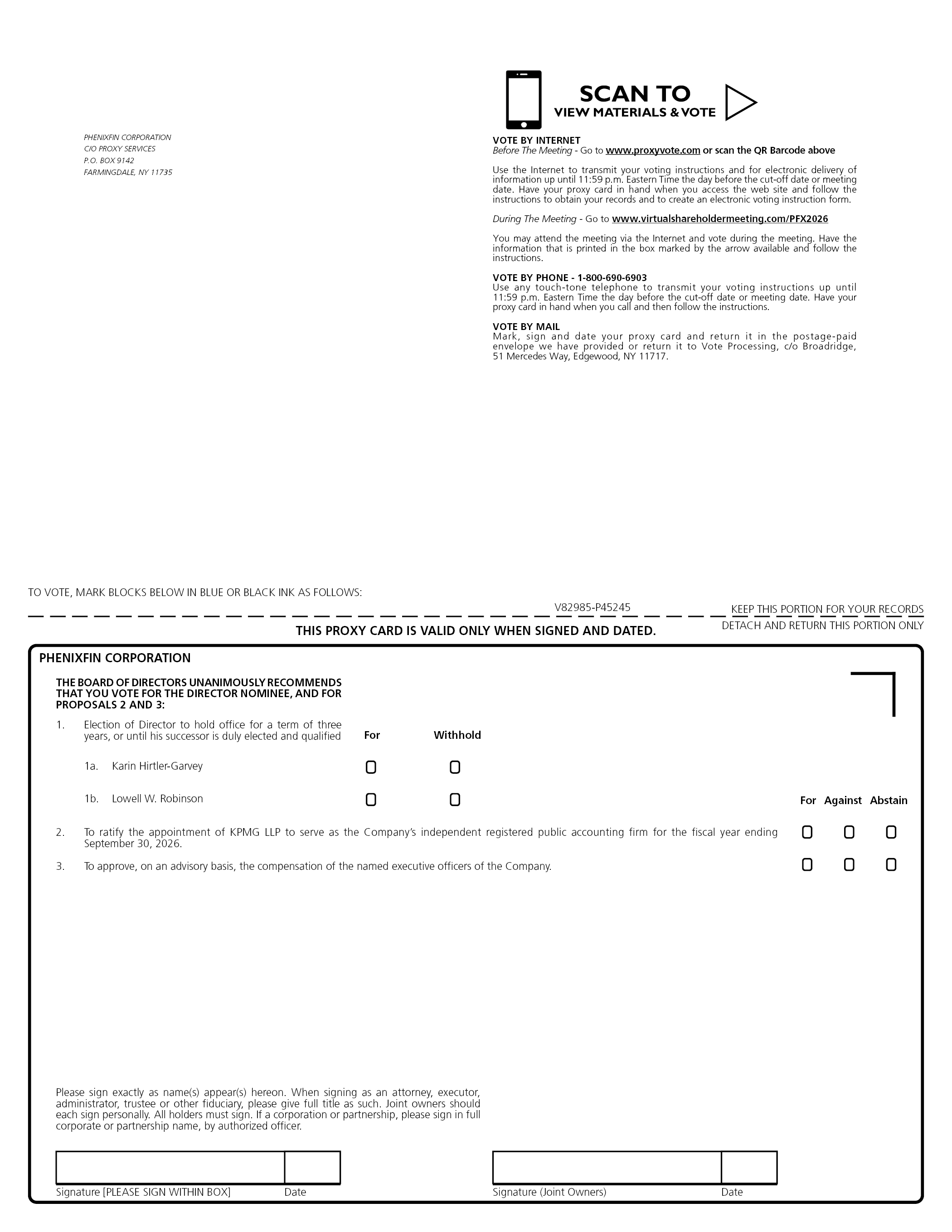 PHENIXFIN CORPORATION C/O PROXY SERVICES P.O. BOX 9142 FARMINGDALE, NY 11735 SCAN TO VIEW MATERIALS & VOTE VOTE BY INTERNET Before The Meeting - Go to www.proxyvote.com or scan the QR Barcode above Use the Internet to transmit your voting instructions and for electronic delivery of information up until 11:59 p.m. Eastern Time the day before the cut-off date or meeting date. Have your proxy card in hand when you access the web site and follow the instructions to obtain your records and to create an electronic voting instruction form. During The Meeting - Go to www.virtualshareholdermeeting.com/PFX2026 You may attend the meeting via the Internet and vote during the meeting. Have the information that is printed in the box marked by the arrow available and follow the instructions. VOTE BY PHONE - 1-800-690-6903 Use any touch-tone telephone to transmit your voting instructions up until 11:59 p.m. Eastern Time the day before the cut-off date or meeting date. Have your proxy card in hand when you call and then follow the instructions. VOTE BY MAIL Mark, sign and date your proxy card and return it in the postage-paid envelope we have provided or return it to Vote Processing, c/o Broadridge, 51 Mercedes Way, Edgewood, NY 11717. TO VOTE, MARK BLOCKS BELOW IN BLUE OR BLACK INK AS FOLLOWS: V82985-P45245 KEEP THIS PORTION FOR YOUR RECORDSTHIS PROXY CARD IS VALID ONLY WHEN SIGNED AND DATED. DETACH AND RETURN THIS PORTION ONLY PHENIXFIN CORPORATION THE BOARD OF DIRECTORS UNANIMOUSLY RECOMMENDS THAT YOU VOTE FOR THE DIRECTOR NOMINEE, AND FOR PROPOSALS 2 AND 3: 1. Election of Director to hold office for a term of three years, or until his successor is duly elected and qualified 1a. Karin Hirtler-Garvey 1b. Lowell W. Robinson 2. To ratify the appointment of KPMG LLP to serve as the Company’s independent registered public accounting firm for the fiscal year ending September 30, 2026. 3. To approve, on an advisory basis, the compensation of the named executive officers of the Company. For Against Abstain Please sign exactly as name(s) appear(s) hereon. When signing as an attorney, executor, administrator, trustee or other fiduciary, please give full title as such. Joint owners should each sign personally. All holders must sign. If a corporation or partnership, please sign in full corporate or partnership name, by authorized officer. Signature [PLEASE SIGN WITHIN BOX] Date Signature (Joint Owners) Date