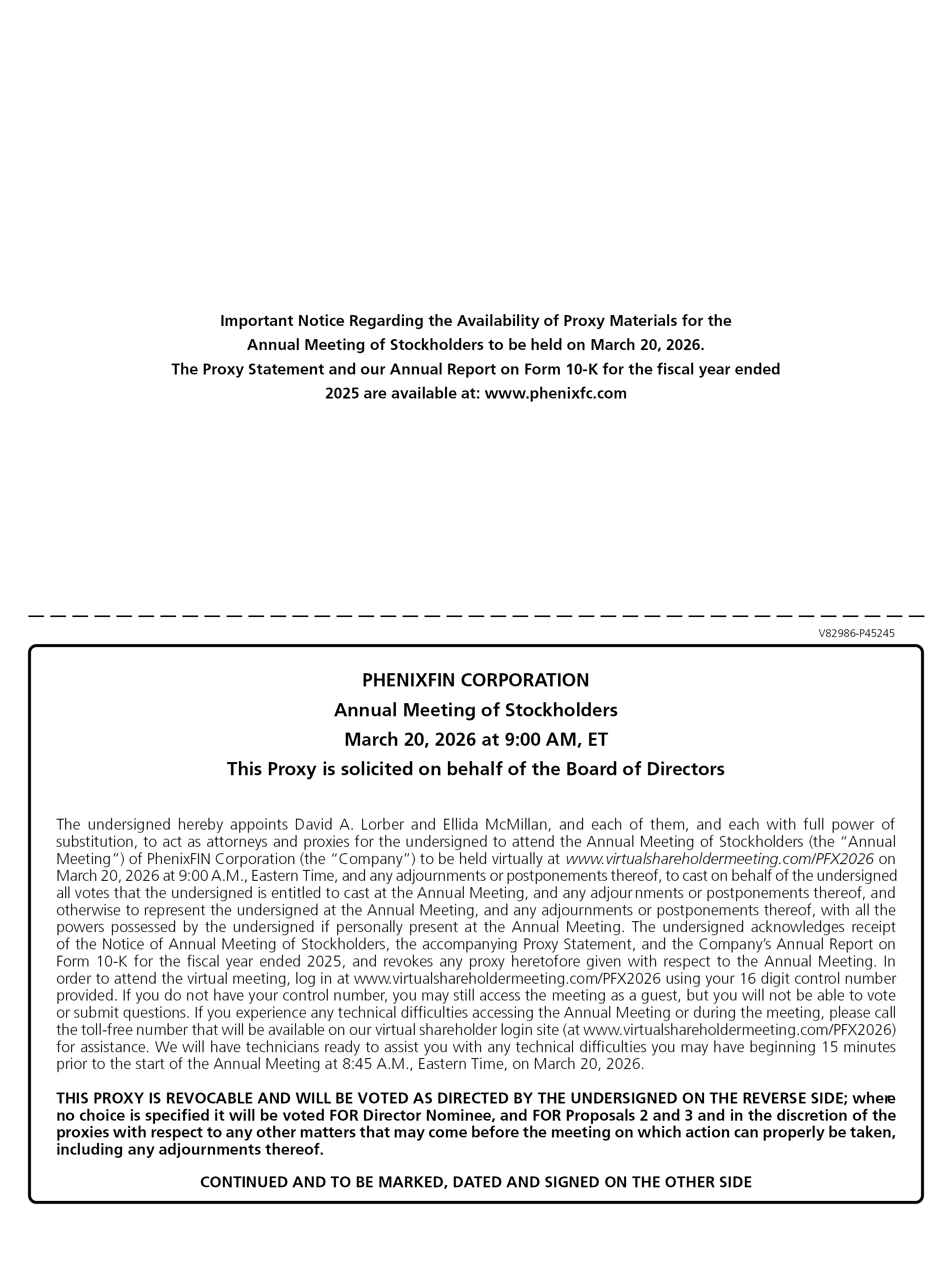Important Notice Regarding the Availability of Proxy Materials for the Annual Meeting of Stockholders to be held on March 20, 2026. The Proxy Statement and our Annual Report on Form 10-K for the fiscal year ended 2025 are available at: www.phenixfc.com PHENIXFIN CORPORATION Annual Meeting of Stockholders March 20, 2026 at 9:00 AM, ET This Proxy is solicited on behalf of the Board of Directors The undersigned hereby appoints David A. Lorber and Ellida McMillan, and each of them, and each with full power of substitution, to act as attorneys and proxies for the undersigned to attend the Annual Meeting of Stockholders (the “Annual Meeting”) of PhenixFIN Corporation (the “Company”) to be held virtually at www.virtualshareholdermeeting.com/PFX2026 on March 20, 2026 at 9:00 A.M., Eastern Time, and any adjournments or postponements thereof, to cast on behalf of the undersigned all votes that the undersigned is entitled to cast at the Annual Meeting, and any adjournments or postponements thereof, and otherwise to represent the undersigned at the Annual Meeting, and any adjournments or postponements thereof, with all the powers possessed by the undersigned if personally present at the Annual Meeting. The undersigned acknowledges receipt of the Notice of Annual Meeting of Stockholders, the accompanying Proxy Statement, and the Company’s Annual Report on Form 10-K for the fiscal year ended 2025, and revokes any proxy heretofore given with respect to the Annual Meeting. In order to attend the virtual meeting, log in at www.virtualshareholdermeeting.com/PFX2026 using your 16 digit control number provided. If you do not have your control number, you may still access the meeting as a guest, but you will not be able to vote or submit questions. If you experience any technical difficulties accessing the Annual Meeting or during the meeting, please call the toll-free number that will be available on our virtual shareholder login site (at www.virtualshareholdermeeting.com/PFX2026) for assistance. We will have technicians ready to assist you with any technical difficulties you may have beginning 15 minutes prior to the start of the Annual Meeting at 8:45 A.M., Eastern Time, on March 20, 2026. THIS PROXY IS REVOCABLE AND WILL BE VOTED AS DIRECTED BY THE UNDERSIGNED ON THE REVERSE SIDE; where no choice is specified it will be voted FOR Director Nominee, and FOR Proposals 2 and 3 and in the discretion of the proxies with respect to any other matters that may come before the meeting on which action can properly be taken, including any adjournments thereof. CONTINUED AND TO BE MARKED, DATED AND SIGNED ON THE OTHER SIDE