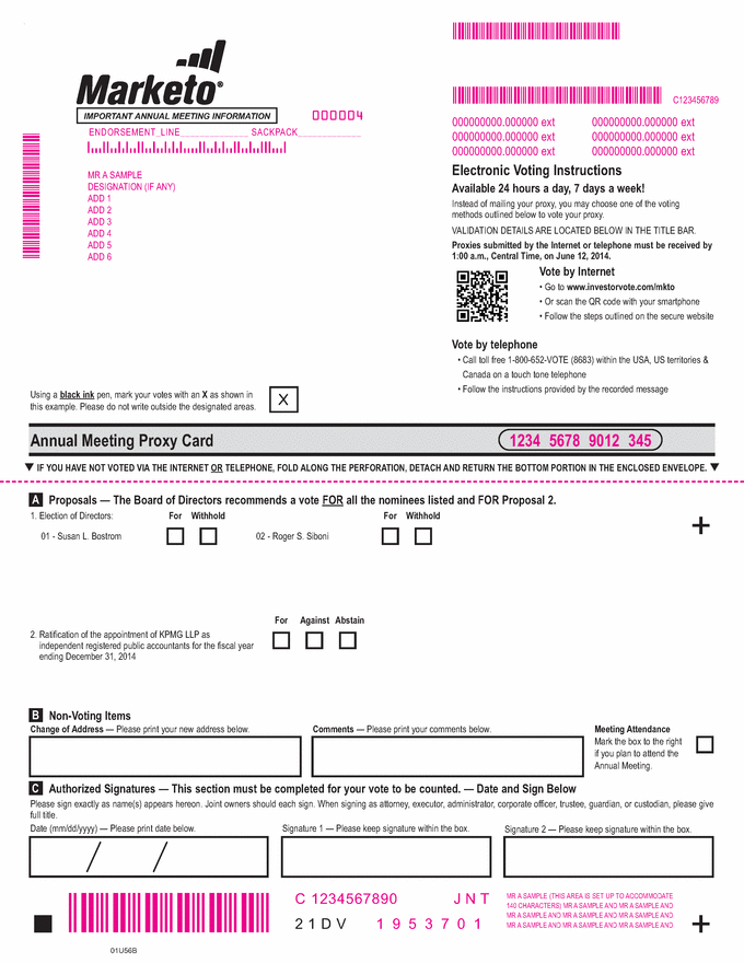 Using a black ink pen, mark your votes with an X as shown in this example. Please do not write outside the designated areas. X 01U56B 2 1 D V + Annual Meeting Proxy Card . Authorized Signatures — This section must be completed for your vote to be counted. — Date and Sign Below C Please sign exactly as name(s) appears hereon. Joint owners should each sign. When signing as attorney, executor, administrator, corporate officer, trustee, guardian, or custodian, please give full title. Signature 1 — Please keep signature within the box. Signature 2 — Please keep signature within the box. Date (mm/dd/yyyy) — Please print date below. + Change of Address — Please print your new address below. Comments — Please print your comments below. B Non-Voting Items A Proposals — The Board of Directors recommends a vote FOR all the nominees listed and FOR Proposal 2. For Against Abstain 2. Ratification of the appointment of KPMG LLP as independent registered public accountants for the fiscal year ending December 31, 2014 Meeting Attendance Mark the box to the right if you plan to attend the Annual Meeting. 01 - Susan L. Bostrom 02 - Roger S. Siboni 1. Election of Directors: For Withhold For Withhold IMPORTANT ANNUAL MEETING INFORMATION MMMMMMMMMMMM MMMMMMMMMMMMMMM 000000000.000000 ext 000000000.000000 ext 000000000.000000 ext 000000000.000000 ext 000000000.000000 ext 000000000.000000 ext 000004 MR A SAMPLE DESIGNATION (IF ANY) ADD 1 ADD 2 ADD 3 ADD 4 ADD 5 ADD 6 ENDORSEMENT_LINE______________ SACKPACK_____________ 1234 5678 9012 345 MMMMMMM 1 9 5 3 7 0 1 MR A SAMPLE (THIS AREA IS SET UP TO ACCOMMODATE 140 CHARACTERS) MR A SAMPLE AND MR A SAMPLE AND MR A SAMPLE AND MR A SAMPLE AND MR A SAMPLE AND MR A SAMPLE AND MR A SAMPLE AND MR A SAMPLE AND MMMMMMMMM C 1234567890 J N T C123456789 qIF YOU HAVE NOT VOTED VIA THE INTERNET OR TELEPHONE, FOLD ALONG THE PERFORATION, DETACH AND RETURN THE BOTTOM PORTION IN THE ENCLOSED ENVELOPE.q Electronic Voting Instructions Available 24 hours a day, 7 days a week! Instead of mailing your proxy, you may choose one of the voting methods outlined below to vote your proxy. VALIDATION DETAILS ARE LOCATED BELOW IN THE TITLE BAR. Proxies submitted by the Internet or telephone must be received by 1:00 a.m., Central Time, on June 12, 2014. Vote by Internet • Go to www.investorvote.com/mkto • Or scan the QR code with your smartphone • Follow the steps outlined on the secure website Vote by telephone • Call toll free 1-800-652-VOTE (8683) within the USA, US territories & Canada on a touch tone telephone • Follow the instructions provided by the recorded message |