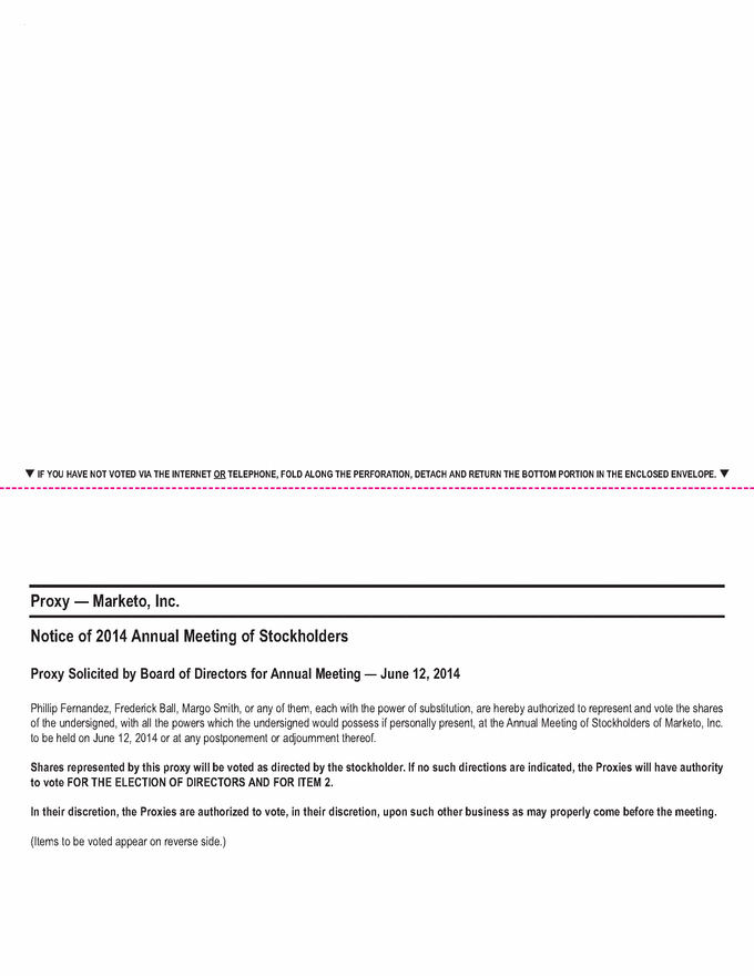 . Notice of 2014 Annual Meeting of Stockholders Proxy Solicited by Board of Directors for Annual Meeting — June 12, 2014 Phillip Fernandez, Frederick Ball, Margo Smith, or any of them, each with the power of substitution, are hereby authorized to represent and vote the shares of the undersigned, with all the powers which the undersigned would possess if personally present, at the Annual Meeting of Stockholders of Marketo, Inc. to be held on June 12, 2014 or at any postponement or adjournment thereof. Shares represented by this proxy will be voted as directed by the stockholder. If no such directions are indicated, the Proxies will have authority to vote FOR THE ELECTION OF DIRECTORS AND FOR ITEM 2. In their discretion, the Proxies are authorized to vote, in their discretion, upon such other business as may properly come before the meeting. (Items to be voted appear on reverse side.) Proxy — Marketo, Inc. qIF YOU HAVE NOT VOTED VIA THE INTERNET OR TELEPHONE, FOLD ALONG THE PERFORATION, DETACH AND RETURN THE BOTTOM PORTION IN THE ENCLOSED ENVELOPE.q |