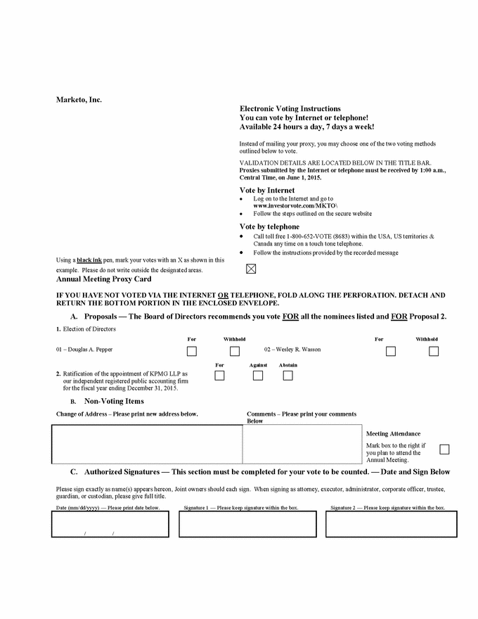 Marketo, Inc. Electronic Voting Instructions You can vote by Internet or telephone! Available 24 hours a day, 7 days a week! Instead of mailing your proxy, you may choose one of the two voting methods outlined below to vote. VALIDATION DETAILS ARE LOCATED BELOW IN THE TITLE BAR. Proxies submitted by the Internet or telephone must be received by 1:00 a.m., Central Time, on June 1, 2015. Vote by Internet • Log on to the Internet and go to www.investorvote.com/MKTO\ • Follow the steps outlined on the secure website Vote by telephone • Call toll free 1-800-652-VOTE (8683) within the USA, US territories & Canada any time on a touch tone telephone. • Follow the instructions provided by the recorded message Using a black ink pen, mark your votes with an X as shown in this example. Please do not write outside the designated areas. Annual Meeting Proxy Card IF YOU HAVE NOT VOTED VIA THE INTERNET OR TELEPHONE, FOLD ALONG THE PERFORATION. DETACH AND RETURN THE BOTTOM PORTION IN THE ENCLOSED ENVELOPE. A. Proposals — The Board of Directors recommends you vote FOR all the nominees listed and FOR Proposal 2. 1. Election of Directors For Withhold For Withhold 01 – Douglas A. Pepper 02 – Wesley R. Wasson For Against Abstain 2. Ratification of the appointment of KPMG LLP as our independent registered public accounting firm for the fiscal year ending December 31, 2015. B. Non-Voting Items Change of Address – Please print new address below. Comments – Please print your comments Below Meeting Attendance Mark box to the right if you plan to attend the Annual Meeting. C. Authorized Signatures — This section must be completed for your vote to be counted. — Date and Sign Below Please sign exactly as name(s) appears hereon, Joint owners should each sign. When signing as attorney, executor, administrator, corporate officer, trustee, guardian, or custodian, please give full title. Date (mm/dd/yyyy) — Please print date below. Signature 1 — Please keep signature within the box. Signature 2 — Please keep signature within the box. / / |