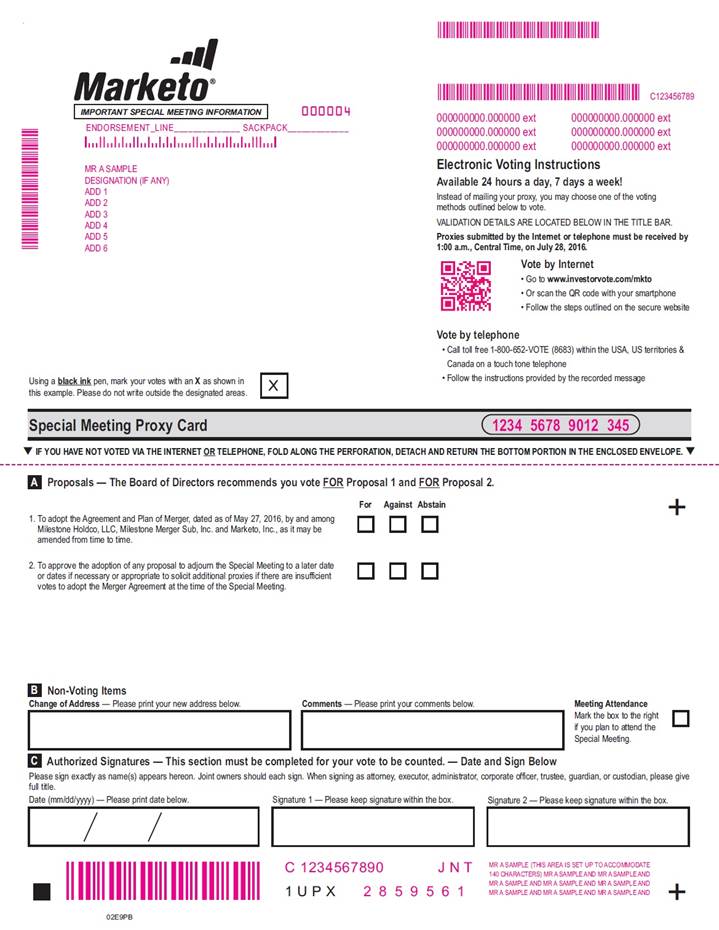 MMMMMMMMMMMM . MMMMMMMMMMMMMMM C123456789 000004 000000000.000000 ext 000000000.000000 ext 000000000.000000 ext 000000000.000000 ext 000000000.000000 ext 000000000.000000 ext ENDORSEMENT_LINE______________ SACKPACK_____________ Electronic Voting Instructions Available 24 hours a day, 7 days a week! Instead of mailing your proxy, you may choose one of the voting methods outlined below to vote. VALIDATION DETAILS ARE LOCATED BELOW IN THE TITLE BAR. Proxies submitted by the Internet or telephone must be received by 1:00 a.m., Central Time, on July 28, 2016. MR A SAMPLE DESIGNATION (IF ANY) ADD 1 ADD 2 ADD 3 ADD 4 ADD 5 ADD 6 Vote by Internet • Go to www.investorvote.com/mkto • Or scan the QR code with your smartphone • Follow the steps outlined on the secure website Vote by telephone • Call toll free 1-800-652-VOTE (8683) within the USA, US territories & Canada on a touch tone telephone • Follow the instructions provided by the recorded message Using a black ink pen, mark your votes with an X as shown in this example. Please do not write outside the designated areas. q IF YOU HAVE NOT VOTED VIA THE INTERNET OR TELEPHONE, FOLD ALONG THE PERFORATION, DETACH AND RETURN THE BOTTOM PORTION IN THE ENCLOSED ENVELOPE. q Proposals — The Board of Directors recommends you vote FOR Proposal 1 and FOR Proposal 2. ForAgainst Abstain + 1. To adopt the Agreement and Plan of Merger, dated as of May 27, 2016, by and among Milestone Holdco, LLC, Milestone Merger Sub, Inc. and Marketo, Inc., as it may be amended from time to time. 2. To approve the adoption of any proposal to adjourn the Special Meeting to a later date or dates if necessary or appropriate to solicit additional proxies if there are insufficient votes to adopt the Merger Agreement at the time of the Special Meeting. Non-Voting Items Change of Address — Please print your new address below. Comments — Please print your comments below. Meeting Attendance Mark the box to the right if you plan to attend the Special Meeting. Authorized Signatures — This section must be completed for your vote to be counted. — Date and Sign Below Please sign exactly as name(s) appears hereon. Joint owners should each sign. When signing as attorney, executor, administrator, corporate officer, trustee, guardian, or custodian, please give full title. Date (mm/dd/yyyy) — Please print date below. Signature 1 — Please keep signature within the box. Signature 2 — Please keep signature within the box. MMMMMMMC 1234567890 J N T MR A SAMPLE (THIS AREA IS SET UP TO ACCOMMODATE 140 CHARACTERS) MR A SAMPLE AND MR A SAMPLE AND MR A SAMPLE AND MR A SAMPLE AND MR A SAMPLE AND MR A SAMPLE AND MR A SAMPLE AND MR A SAMPLE AND + 1 U P X2 8 5 9 5 6 1 02E9PB MMMMMMMMM C B A Special Meeting Proxy Card1234 5678 9012 345 X IMPORTANT SPECIAL MEETING INFORMATION