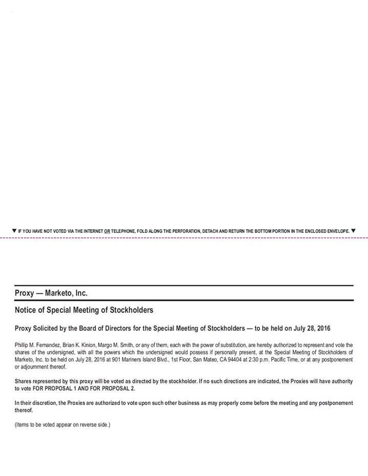 . q IF YOU HAVE NOT VOTED VIA THE INTERNET OR TELEPHONE, FOLD ALONG THE PERFORATION, DETACH AND RETURN THE BOTTOM PORTION IN THE ENCLOSED ENVELOPE. q Proxy — Marketo, Inc. Notice of Special Meeting of Stockholders Proxy Solicited by the Board of Directors for the Special Meeting of Stockholders — to be held on July 28, 2016 Phillip M. Fernandez, Brian K. Kinion, Margo M. Smith, or any of them, each with the power of substitution, are hereby authorized to represent and vote the shares of the undersigned, with all the powers which the undersigned would possess if personally present, at the Special Meeting of Stockholders of Marketo, Inc. to be held on July 28, 2016 at 901 Mariners Island Blvd., 1st Floor, San Mateo, CA 94404 at 2:30 p.m. Pacific Time, or at any postponement or adjournment thereof. Shares represented by this proxy will be voted as directed by the stockholder. If no such directions are indicated, the Proxies will have authority to vote FOR PROPOSAL 1 AND FOR PROPOSAL 2. In their discretion, the Proxies are authorized to vote upon such other business as may properly come before the meeting and any postponement thereof. (Items to be voted appear on reverse side.)