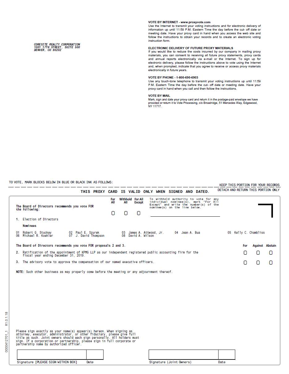VOTE BY INTERNET - www.proxyvote.com Use the Internet to transmit your voting instructions and for electronic delivery of information up until 11:59 P.M. Eastern Time the day before the cut-off date or meeting date. Have your proxy card in hand when you access the web site and follow the instructions to obtain your records and to create an electronic voting instruction form. CORESITE REALTY CORPORATION 1001 17TH STREET, SUITE 500 DENVER, CO 80202 ELECTRONIC DELIVERY OF FUTURE PROXY MATERIALS If you would like to reduce the costs incurred by our company in mailing proxy materials, you can consent to receiving all future proxy statements, proxy cards and annual reports electronically via e-mail or the Internet. To sign up for electronic delivery, please follow the instructions above to vote using the Internet and, when prompted, indicate that you agree to receive or access proxy materials electronically in future years. VOTE BY PHONE - 1-800-690-6903 Use any touch-tone telephone to transmit your voting instructions up until 11:59 P.M. Eastern Time the day before the cut-off date or meeting date. Have your proxy card in hand when you call and then follow the instructions. VOTE BY MAIL Mark, sign and date your proxy card and return it in the postage-paid envelope we have provided or return it to Vote Processing, c/o Broadridge, 51 Mercedes Way, Edgewood, NY 11717. TO VOTE, MARK BLOCKS BELOW IN BLUE OR BLACK INK AS FOLLOWS: KEEP THIS PORTION FOR YOUR RECORDS DETACH AND RETURN THIS PORTION ONLY THIS PROXY CARD IS VALID ONLY WHEN SIGNED AND DATED. For Withhold For All Except To withhold authority to vote for any individual nominee(s), mark “For All Except” and write the number(s) of the AllAll The Board of Directors recommends you vote FOR the following: nominee(s) on the line below. 0 0 0 1. Election of Directors Nominees 01 Robert G. Stuckey 06 Michael R. Koehler 02 Paul E. Szurek 07 J. David Thompson 03 James A. Attwood, Jr. 08 David A. Wilson 04 Jean A. Bua 05 Kelly C. Chambliss The Board of Directors recommends you vote FOR proposals 2 and 3. 2. Ratification of the appointment of KPMG LLP as our independent registered public accounting firm for the fiscal year ending December 31, 2019. 3. The advisory vote to approve the compensation of our named executive officers. For 0 0 Against 0 0 Abstain 0 0 NOTE: Such other business as may properly come before the meeting or any adjournment thereof. Please sign exactly as your name(s) appear(s) hereon. When signing as attorney, executor, administrator, or other fiduciary, please give full title as such. Joint owners should each sign personally. All holders must sign. If a corporation or partnership, please sign in full corporate or partnership name by authorized officer. Signature [PLEASE SIGN WITHIN BOX] Date Signature (Joint Owners) Date 0000412701_1 R1.0.1.18
