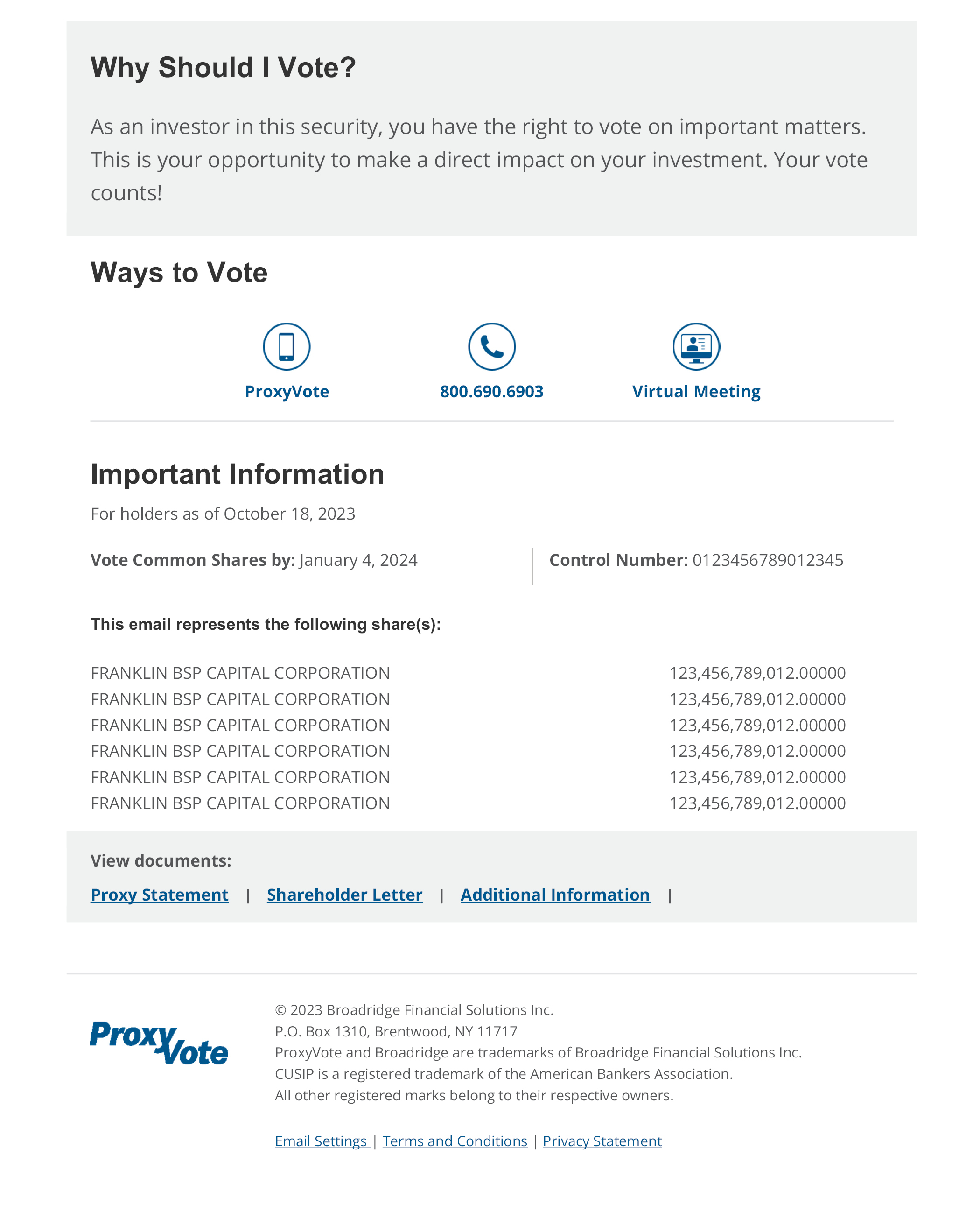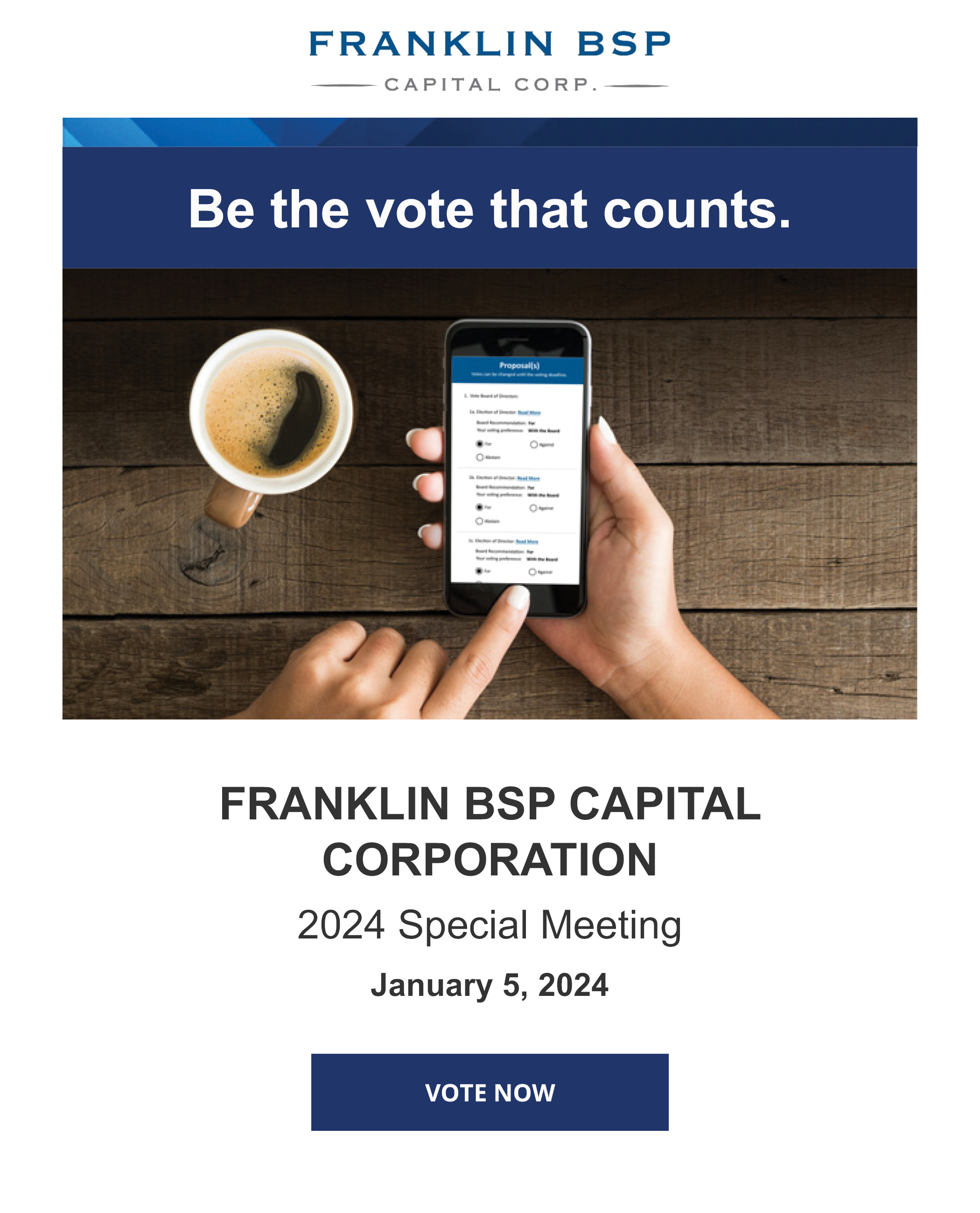 Some of the statements in this document constitute forward-looking statements because they relate to future events, future performance or financial condition. The forward-looking statements may include statements as to: future operating results of Franklin BSP Capital Corporation, a Delaware corporation (“FBCC”), and Franklin BSP Lending Corporation, a Maryland corporation (“FBLC”), and distribution projections; business prospects of FBCC and FBLC and the prospects of their portfolio companies; and the impact of the investments that FBCC and FBLC expect to make. In addition, words such as “anticipate,” “believe,” “expect,” “seek,” “plan,” “should,” “estimate,” “project” and “intend” indicate forward-looking statements, although not all forward-looking statements include these words. The forward-looking statements contained in this document involve risks and uncertainties. Certain factors could cause actual results and conditions to differ materially from those projected, including the uncertainties associated with (i) the ability of the parties to consummate the mergers contemplated by the Agreement and Plan of Merger among FBCC, FBLC, Franklin BSP Merger Sub, Inc., a Maryland corporation, and, solely for the limited purposes set forth therein, Franklin BSP Capital Adviser L.L.C. (“FBCA”), a Delaware limited liability company and the external investment adviser to FBCC (the “Mergers”), on the expected timeline, or at all; (ii) the expected synergies and savings associated with the Mergers; (iii) the ability to realize the anticipated benefits of the Mergers, including the expected elimination of certain expenses and costs due to the Mergers; (iv) the percentage of FBCC’s stockholders and FBLC’s stockholders voting in favor of the applicable Proposals (as defined below); (v) the possibility that competing offers or acquisition proposals will be made; (vi) the possibility that any or all of the various conditions to the consummation of the Mergers may not be satisfied or waived; (vii) risks related to diverting management’s attention from ongoing business operations; (viii) the combined company’s plans, expectations, objectives and intentions, as a result of the Mergers; (ix) any potential termination of the Merger Agreement; (x) the future operating results and net investment income projections of FBCC, FBLC or, following the Mergers, the combined company; (xi) the ability of FBCA to implement FBCA’s future plans with respect to the combined company; (xii) the ability of FBCA and its affiliates to attract and retain highly talented professionals; (xiii) the business prospects of FBCC, FBLC or, following the Mergers, the combined company and the prospects of their portfolio companies; (xiv) the impact of the investments that FBCC, FBLC or, following the Mergers, the combined company expect to make; (xv) the ability of the portfolio companies of FBCC, FBLC or, following the Mergers, the combined company to achieve their objectives; (xvi) the expected financings and investments and additional leverage that FBCC, FBLC or, following the Mergers, the combined company may seek to incur in the future; (xvii) the adequacy of the cash resources and working capital of FBCC, FBLC or, following the Mergers, the combined company; (xviii) the timing of cash flows, if any, from the operations of the portfolio companies of FBCC, FBLC or, following the Mergers, the combined company; (xix) future changes in laws or regulations (including the interpretation of these laws and regulations by regulatory authorities); and (xx) the risk that stockholder litigation in connection with the Mergers may result in significant costs of defense and liability. FBCC and FBLC have based the forward-looking statements included in this document on information available to them on the date hereof, and they assume no obligation to update any such forward-looking statements. Although FBCC and FBLC undertake no obligation to revise or update any forward-looking statements, whether as a result of new information, future events or otherwise, you are advised to consult any additional disclosures that they may make directly to you or through reports that FBCC and FBLC in the future may file with the Securities and Exchange Commission (“SEC”), including the Joint Proxy Statement and the Registration Statement (in each case, as defined below), annual reports on Form 10-K, quarterly reports on Form 10-Q and current reports on Form 8-K.