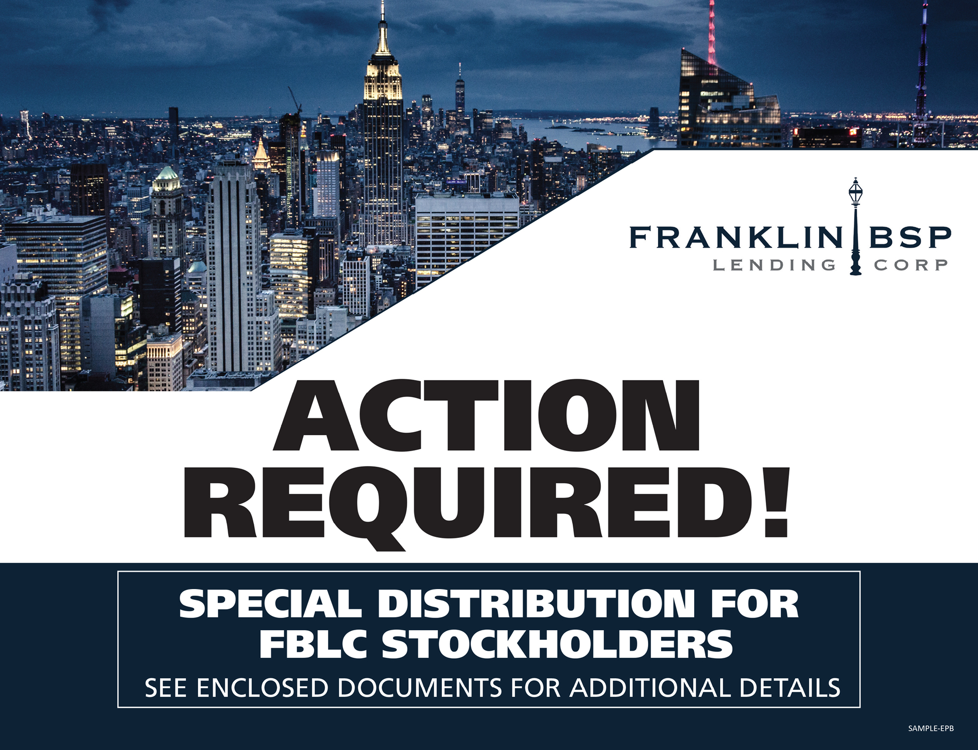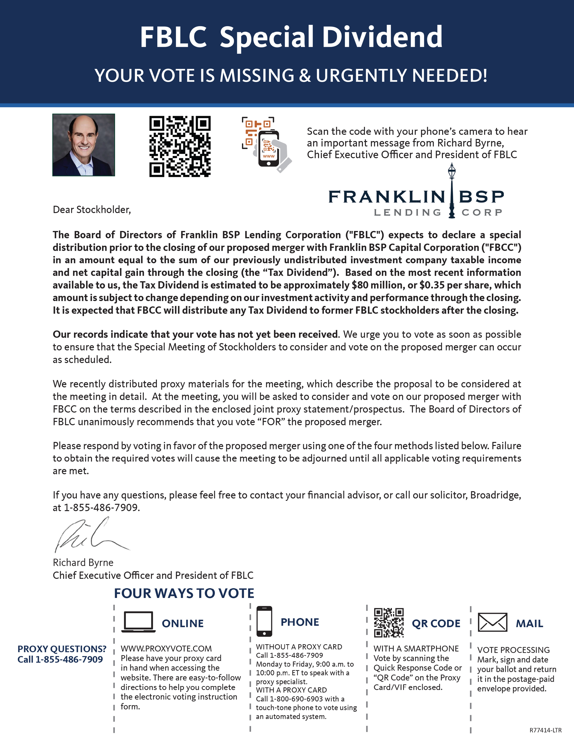 Some of the statements in this document constitute forward-looking statements because they relate to future events, future performance or financial condition. The forward-looking statements may include statements as to: future operating results of Franklin BSP Capital Corporation, a Delaware corporation (“FBCC”), and Franklin BSP Lending Corporation, a Maryland corporation (“FBLC”), and distribution projections; business prospects of FBCC and FBLC and the prospects of their portfolio companies; and the impact of the investments that FBCC and FBLC expect to make. In addition, words such as “anticipate,” “believe,” “expect,” “seek,” “plan,” “should,” “estimate,” “project” and “intend” indicate forward-looking statements, although not all forward-looking statements include these words. The forward-looking statements contained in this document involve risks and uncertainties. Certain factors could cause actual results and conditions to differ materially from those projected, including the uncertainties associated with (i) the ability of the parties to consummate the mergers contemplated by the Agreement and Plan of Merger among FBCC, FBLC, Franklin BSP Merger Sub, Inc., a Maryland corporation, and, solely for the limited purposes set forth therein, Franklin BSP Capital Adviser L.L.C. (“FBCA”), a Delaware limited liability company and the external investment adviser to FBCC (the “Mergers”), on the expected timeline, or at all; (ii) the expected synergies and savings associated with the Mergers; (iii) the ability to realize the anticipated benefits of the Mergers, including the expected elimination of certain expenses and costs due to the Mergers; (iv) the percentage of FBCC’s stockholders and FBLC’s stockholders voting in favor of the applicable Proposals (as defined below); (v) the possibility that competing offers or acquisition proposals will be made; (vi) the possibility that any or all of the various conditions to the consummation of the Mergers may not be satisfied or waived; (vii) risks related to diverting management’s attention from ongoing business operations; (viii) the combined company’s plans, expectations, objectives and intentions, as a result of the Mergers; (ix) any potential termination of the Merger Agreement; (x) the future operating results and net investment income projections of FBCC, FBLC or, following the Mergers, the combined company; (xi) the ability of FBCA to implement FBCA’s future plans with respect to the combined company; (xii) the ability of FBCA and its affiliates to attract and retain highly talented professionals; (xiii) the business prospects of FBCC, FBLC or, following the Mergers, the combined company and the prospects of their portfolio companies; (xiv) the impact of the investments that FBCC, FBLC or, following the Mergers, the combined company expect to make; (xv) the ability of the portfolio companies of FBCC, FBLC or, following the Mergers, the combined company to achieve their objectives; (xvi) the expected financings and investments and additional leverage that FBCC, FBLC or, following the Mergers, the combined company may seek to incur in the future; (xvii) the adequacy of the cash resources and working capital of FBCC, FBLC or, following the Mergers, the combined company; (xviii) the timing of cash flows, if any, from the operations of the portfolio companies of FBCC, FBLC or, following the Mergers, the combined company; (xix) future changes in laws or regulations (including the interpretation of these laws and regulations by regulatory authorities); and (xx) the risk that stockholder litigation in connection with the Mergers may result in significant costs of defense and liability. FBCC and FBLC have based the forward-looking statements included in this document on information available to them on the date hereof, and they assume no obligation to update any such forward-looking statements. Although FBCC and FBLC undertake no obligation to revise or update any forward-looking statements, whether as a result of new information, future events or otherwise, you are advised to consult any additional disclosures that they may make directly to you or through reports that FBCC and FBLC in the future may file with the Securities and Exchange Commission (“SEC”), including the Joint Proxy Statement and the Registration Statement (in each case, as defined below), annual reports on Form 10-K, quarterly reports on Form 10-Q and current reports on Form 8-K.