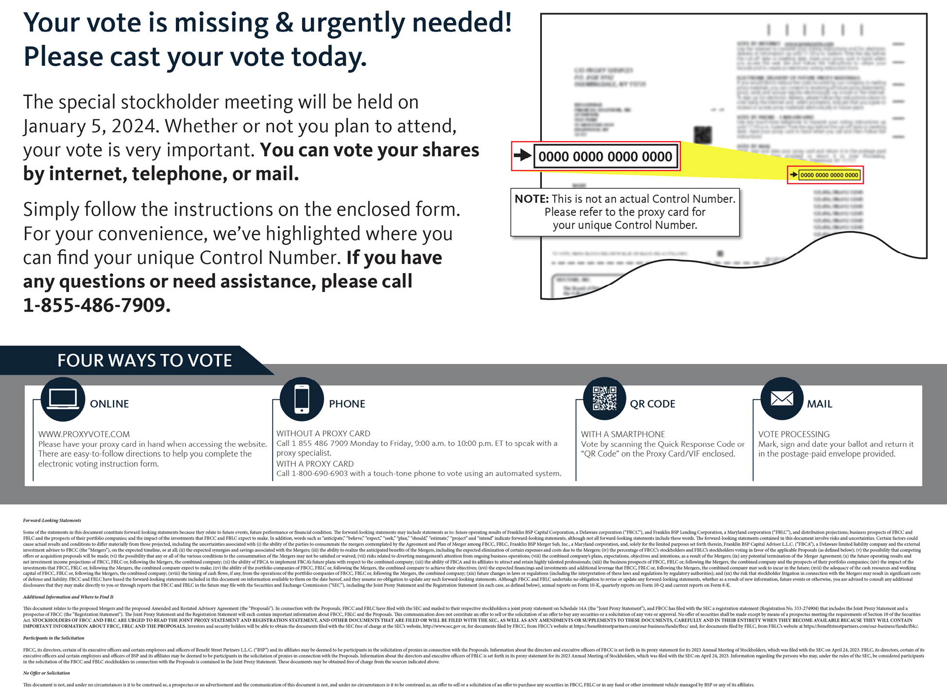 This document relates to the proposed Mergers and the proposed Amended and Restated Advisory Agreement (the “Proposals”). In connection with the Proposals, FBCC and FBLC have filed with the SEC and mailed to their respective stockholders a joint proxy statement on Schedule 14A (the “Joint Proxy Statement”), and FBCC has filed with the SEC a registration statement (Registration No. 333-274904) that includes the Joint Proxy Statement and a prospectus of FBCC (the “Registration Statement”). The Joint Proxy Statement and the Registration Statement will each contain important information about FBCC, FBLC and the Proposals. This communication does not constitute an offer to sell or the solicitation of an offer to buy any securities or a solicitation of any vote or approval. No offer of securities shall be made except by means of a prospectus meeting the requirements of Section 10 of the Securities Act. STOCKHOLDERS OF FBCC AND FBLC ARE URGED TO READ THE JOINT PROXY STATEMENT AND REGISTRATION STATEMENT, AND OTHER DOCUMENTS THAT ARE FILED OR WILL BE FILED WITH THE SEC, AS WELL AS ANY AMENDMENTS OR SUPPLEMENTS TO THESE DOCUMENTS, CAREFULLY AND IN THEIR ENTIRETY WHEN THEY BECOME AVAILABLE BECAUSE THEY WILL CONTAIN IMPORTANT