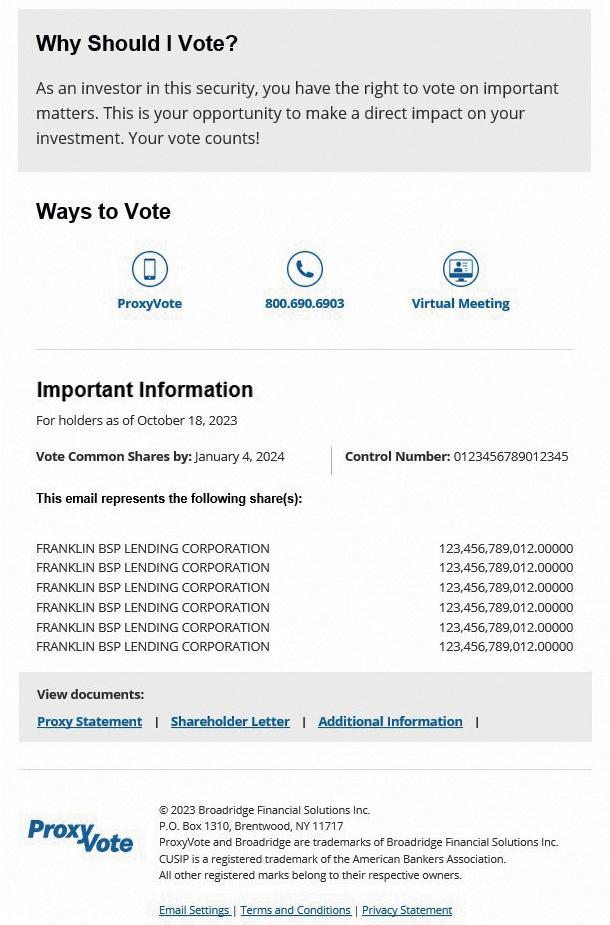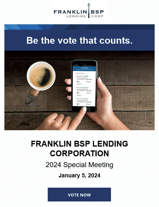 Some of the statements in this document constitute forward-looking statements because they relate to future events, future performance or financial condition. The forward-looking statements may include statements as to: future operating results of Franklin BSP Capital Corporation, a Delaware corporation (“FBCC”), and Franklin BSP Lending Corporation, a Maryland corporation (“FBLC”), and distribution projections; business prospects of FBCC and FBLC and the prospects of their portfolio companies; and the impact of the investments that FBCC and FBLC expect to make. In addition, words such as “anticipate,” “believe,” “expect,” “seek,” “plan,” “should,” “estimate,” “project” and “intend” indicate forward-looking statements, although not all forward-looking statements include these words. The forward-looking statements contained in this document involve risks and uncertainties. Certain factors could cause actual results and conditions to differ materially from those projected, including the uncertainties associated with (i) the ability of the parties to consummate the mergers contemplated by the Agreement and Plan of Merger among FBCC, FBLC, Franklin BSP Merger Sub, Inc., a Maryland corporation, and, solely for the limited purposes set forth therein, Franklin BSP Capital Adviser L.L.C. (“FBCA”), a Delaware limited liability company and the external investment adviser to FBCC (the “Mergers”), on the expected timeline, or at all; (ii) the expected synergies and savings associated with the Mergers; (iii) the ability to realize the anticipated benefits of the Mergers, including the expected elimination of certain expenses and costs due to the Mergers; (iv) the percentage of FBCC’s stockholders and FBLC’s stockholders voting in favor of the applicable Proposals (as defined below); (v) the possibility that competing offers or acquisition proposals will be made; (vi) the possibility that any or all of the various conditions to the consummation of the Mergers may not be satisfied or waived; (vii) risks related to diverting management’s attention from ongoing business operations; (viii) the combined company’s plans, expectations, objectives and intentions, as a result of the Mergers; (ix) any potential termination of the Merger Agreement; (x) the future operating results and net investment income projections of FBCC, FBLC or, following the Mergers, the combined company; (xi) the ability of FBCA to implement FBCA’s future plans with respect to the combined company; (xii) the ability of FBCA and its affiliates to attract and retain highly talented professionals; (xiii) the business prospects of FBCC, FBLC or, following the Mergers, the combined company and the prospects of their portfolio companies; (xiv) the impact of the investments that FBCC, FBLC or, following the Mergers, the combined company expect to make; (xv) the ability of the portfolio companies of FBCC, FBLC or, following the Mergers, the combined company to achieve their objectives; (xvi) the expected financings and investments and additional leverage that FBCC, FBLC or, following the Mergers, the combined company may seek to incur in the future; (xvii) the adequacy of the cash resources and working capital of FBCC, FBLC or, following the Mergers, the combined company; (xviii) the timing of cash flows, if any, from the operations of the portfolio companies of FBCC, FBLC or, following the Mergers, the combined company; (xix) future changes in laws or regulations (including the interpretation of these laws and regulations by regulatory authorities); and (xx) the risk that stockholder litigation in connection with the Mergers may result in significant costs of defense and liability. FBCC and FBLC have based the forward-looking statements included in this document on information available to them on the date hereof, and they assume no obligation to update any such forward-looking statements. Although FBCC and FBLC undertake no obligation to revise or update any forward-looking statements, whether as a result of new information, future events or otherwise, you are advised to consult any additional disclosures that they may make directly to you or through reports that FBCC and FBLC in the future may file with the Securities and Exchange Commission (“SEC”), including the Joint Proxy Statement and the Registration Statement (in each case, as defined below), annual reports on Form 10-K, quarterly reports on Form 10-Q and current reports on Form 8-K.
