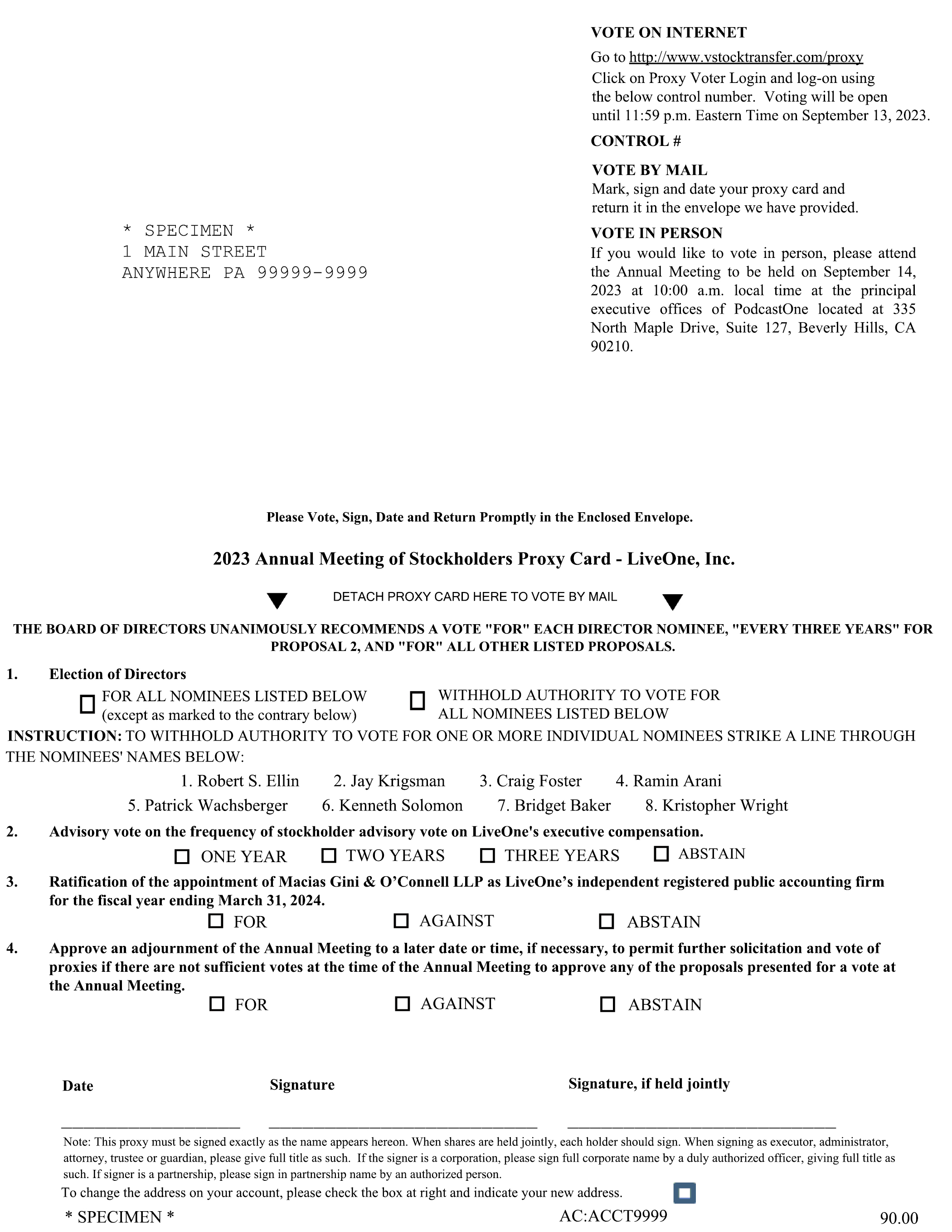 VOTE ON INTERNET Go to http://www.vstocktransfer.com/proxy Click on Proxy Voter Login and log-on using the below control number. Voting will be open until 11:59 p.m. Eastern Time on September 13, 2023. CONTROL VOTE BY MAIL Mark, sign and date your proxy card and return it in the envelope we have provided. SPECIMEN 1 MAIN STREET ANYWHERE PA 99999-9999 VOTE IN PERSON If you would like to vote in person, please attend the Annual Meeting to be held on September 14, 2023 at 10:00 a.m. local time at the principal executive offices of PodcastOne located at 335 North Maple Drive, Suite 127, Beverly Hills, CA 90210. Please Vote, Sign, Date and Return Promptly in the Enclosed Envelope. 2023 Annual Meeting of Stockholders Proxy Card - LiveOne, Inc. DETACH PROXY CARD HERE TO VOTE BY MAIL THE BOARD OF DIRECTORS UNANIMOUSLY RECOMMENDS A VOTE “FOR” EACH DIRECTOR NOMINEE, “EVERY THREE YEARS” FOR PROPOSAL 2, AND “FOR” ALL OTHER LISTED PROPOSALS. 1. Election of Directors WITHHOLD AUTHORITY TO VOTE FOR ALL NOMINEES LISTED BELOW FOR ALL NOMINEES LISTED BELOW (except as marked to the contrary below) INSTRUCTION: TO WITHHOLD AUTHORITY TO VOTE FOR ONE OR MORE INDIVIDUAL NOMINEES STRIKE A LINE THROUGH THE NOMINEES’ NAMES BELOW: 1. Robert S. Ellin 2. Jay Krigsman 3. Craig Foster 4. Ramin Arani 5. Patrick Wachsberger 6. Kenneth Solomon 7. Bridget Baker 8. Kristopher Wright 2. Advisory vote on the frequency of stockholder advisory vote on LiveOne’s executive compensation. ONE YEAR TWO YEARS THREE YEARS ABSTAIN 3. Ratification of the appointment of Macias Gini & O’Connell LLP as LiveOne’s independent registered public accounting firm for the fiscal year ending March 31, 2024. FOR AGAINST ABSTAIN 4. Approve an adjournment of the Annual Meeting to a later date or time, if necessary, to permit further solicitation and vote of proxies if there are not sufficient votes at the time of the Annual Meeting to approve any of the proposals presented for a vote at the Annual Meeting. FOR AGAINST ABSTAIN Date Signature Signature, if held jointly Note: This proxy must be signed exactly as the name appears hereon. When shares are held jointly, each holder should sign. When signing as executor, administrator, attorney, trustee or guardian, please give full title as such. If the signer is a corporation, please sign full corporate name by a duly authorized officer, giving full title as such. If signer is a partnership, please sign in partnership name by an authorized person. To change the address on your account, please check the box at right and indicate your new address. * SPECIMEN * AC:ACCT9999 90.00
