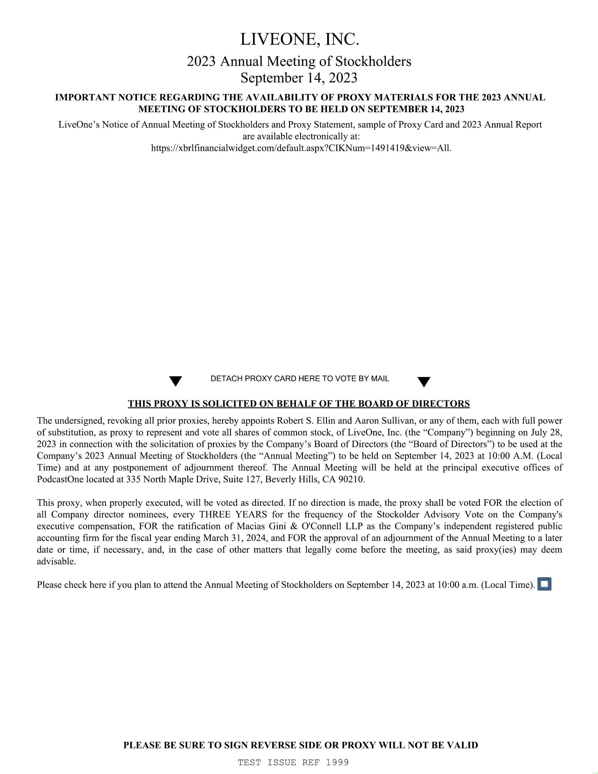 LIVEONE, INC. 2023 Annual Meeting of Stockholders September 14, 2023 IMPORTANT NOTICE REGARDING THE AVAILABILITY OF PROXY MATERIALS FOR THE 2023 ANNUAL MEETING OF STOCKHOLDERS TO BE HELD ON SEPTEMBER 14, 2023 LiveOne’s Notice of Annual Meeting of Stockholders and Proxy Statement, sample of Proxy Card and 2023 Annual Report are available electronically at: https://xbrlfinancialwidget.com/default.aspx?CIKNum=1491419&view=All. DETACH PROXY CARD HERE TO VOTE BY MAIL THIS PROXY IS SOLICITED ON BEHALF OF THE BOARD OF DIRECTORS undersigned, The revoking all prior proxies, hereby appoints Robert S. Ellin and Aaron Sullivan, or any of them, each with full power of substitution, as proxy to represent and vote all shares of common stock, of LiveOne, Inc. (the “Company”) beginning on July 28, 2023 in connection with the solicitation of proxies by the Company’s Board of Directors (the “Board of Directors”) to be used at the Company’s 2023 Annual Meeting of Stockholders (the “Annual Meeting”) to be held on September 14, 2023 at 10:00 A.M. (Local Time) and at any postponement of adjournment thereof. The Annual Meeting will be held at the principal executive offices of PodcastOne located at 335 North Maple Drive, Suite 127, Beverly Hills, CA 90210. This proxy, when properly executed, will be voted as directed. If no direction is made, the proxy shall be voted FOR the election of all Company director nominees, every THREE YEARS for the frequency of the Stockolder Advisory Vote on the Company’s executive compensation, FOR the ratification of Macias Gini & O’Connell LLP as the Company’s independent registered public accounting firm for the fiscal year ending March 31, 2024, and FOR the approval of an adjournment of the Annual Meeting to a later date or time, if necessary, and, in the case of other matters that legally come before the meeting, as said proxy(ies) may deem advisable. Please check here if you plan to attend the Annual Meeting of Stockholders on September 14, 2023 at 10:00 a.m. (Local Time). PLEASE BE SURE TO SIGN REVERSE SIDE OR PROXY WILL NOT BE VALID TEST ISSUE REF 1999