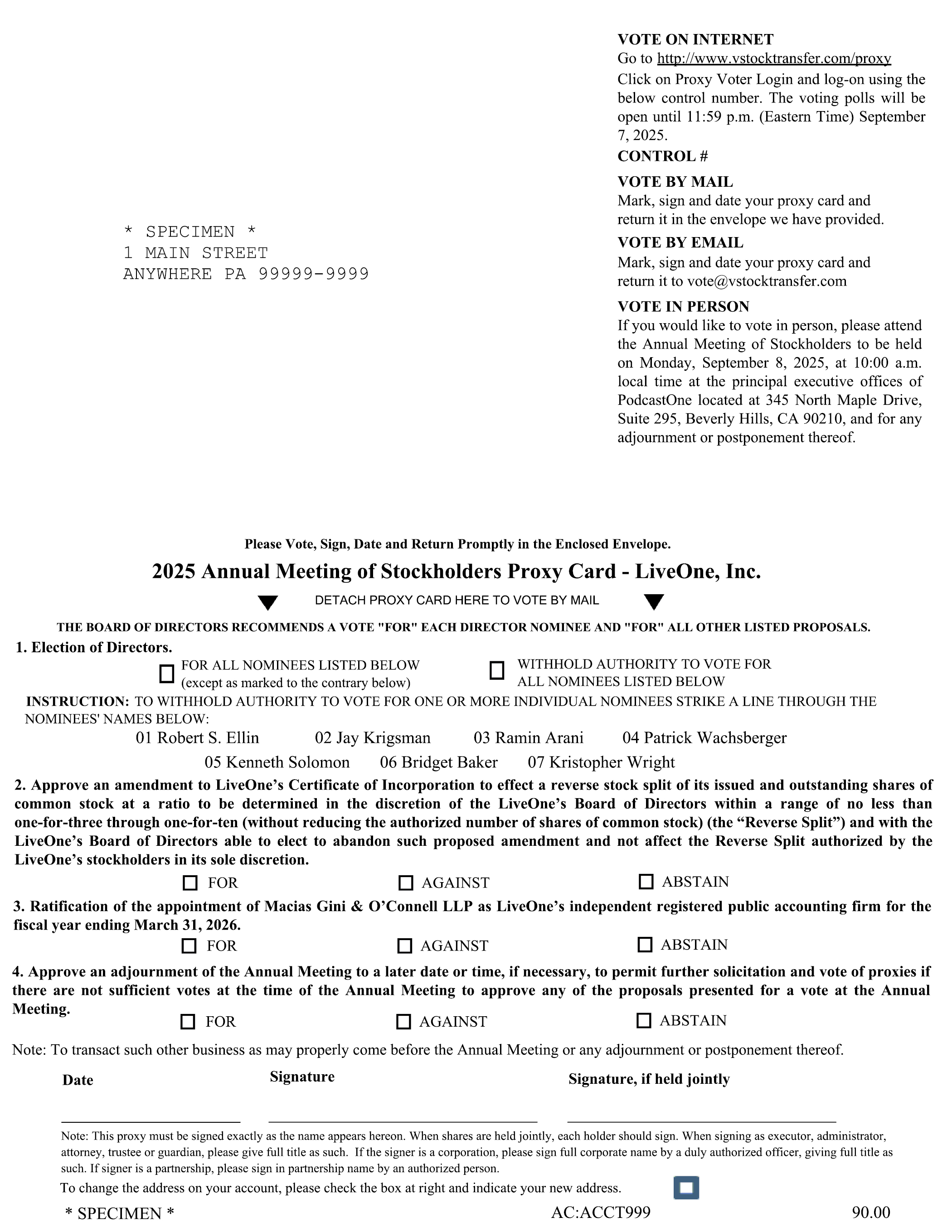 SPECIMEN 1 MAIN STREET ANYWHERE PA 99999-9999 VOTE ON INTERNET Go to http://www.vstocktransfer.com/proxy Click on Proxy Voter Login and log-on using the below control number. The voting polls will be open until 11:59 p.m. (Eastern Time) September 7, 2025. CONTROL # VOTE BY MAIL Mark, sign and date your proxy card and return it in the envelope we have provided. VOTE BY EMAIL Mark, sign and date your proxy card and return it to vote@vstocktransfer.com VOTE IN PERSON If you would like to vote in person, please attend the Annual Meeting of Stockholders to be held on Monday, September 8, 2025, at 10:00 a.m. local time at the principal executive offices of PodcastOne located at 345 North Maple Drive, Suite 295, Beverly Hills, CA 90210, and for any adjournment or postponement thereof. Please Vote, Sign, Date and Return Promptly in the Enclosed Envelope. 2025 Annual Meeting of Stockholders Proxy Card - LiveOne, Inc. DETACH PROXY CARD HERE TO VOTE BY MAIL THE BOARD OF DIRECTORS RECOMMENDS A VOTE “FOR” EACH DIRECTOR NOMINEE AND “FOR” ALL OTHER LISTED PROPOSALS 1. Election of Directors. FOR ALL NOMINEES LISTED BELOW (except as marked to the contrary below) WITHHOLD AUTHORITY TO VOTE FOR ALL NOMINEES LISTED BELOW INSTRUCTION: TO WITHHOLD AUTHORITY TO VOTE FOR ONE OR MORE INDIVIDUAL NOMINEES STRIKE A LINE THROUGH THE NOMINEES’ NAMES BELOW: 01 Robert S. Ellin 02 Jay Krigsman 03 Ramin Arani 04 Patrick Wachsberger 05 Kenneth Solomon 06 Bridget Baker 07 Kristopher Wright 2. Approve an amendment to LiveOne’s Certificate of Incorporation to effect a reverse stock split of its issued and outstanding shares of common stock at a ratio to be determined in the discretion of the LiveOne’s Board of Directors within a range of no less than one-for-three through one-for-ten (without reducing the authorized number of shares of common stock) (the “Reverse Split”) and with the LiveOne’s Board of Directors able to elect to abandon such proposed amendment and not affect the Reverse Split authorized by the LiveOne’s stockholders in its sole discretion. FOR AGAINST ABSTAIN 3. Ratification of the appointment of Macias Gini & O’Connell LLP as LiveOne’s independent registered public accounting firm for the fiscal year ending March 31, 2026. FOR AGAINST ABSTAIN 4. Approve an adjournment of the Annual Meeting to a later date or time, if necessary, to permit further solicitation and vote of proxies if there are not sufficient votes at the time of the Annual Meeting to approve any of the proposals presented for a vote at the Annual Meeting. FOR AGAINST ABSTAIN Note: To transact such other business as may properly come before the Annual Meeting or any adjournment or postponement thereof. Date Signature Signature, if held jointly Note: This proxy must be signed exactly as the name appears hereon. When shares are held jointly, each holder should sign. When signing as executor, administrator, attorney, trustee or guardian, please give full title as such. If the signer is a corporation, please sign full corporate name by a duly authorized officer, giving full title as such. If signer is a partnership, please sign in partnership name by an authorized person To change the address on your account, please check the box at right and indicate your new address. SPECIMEN AC:ACCT999 90.00