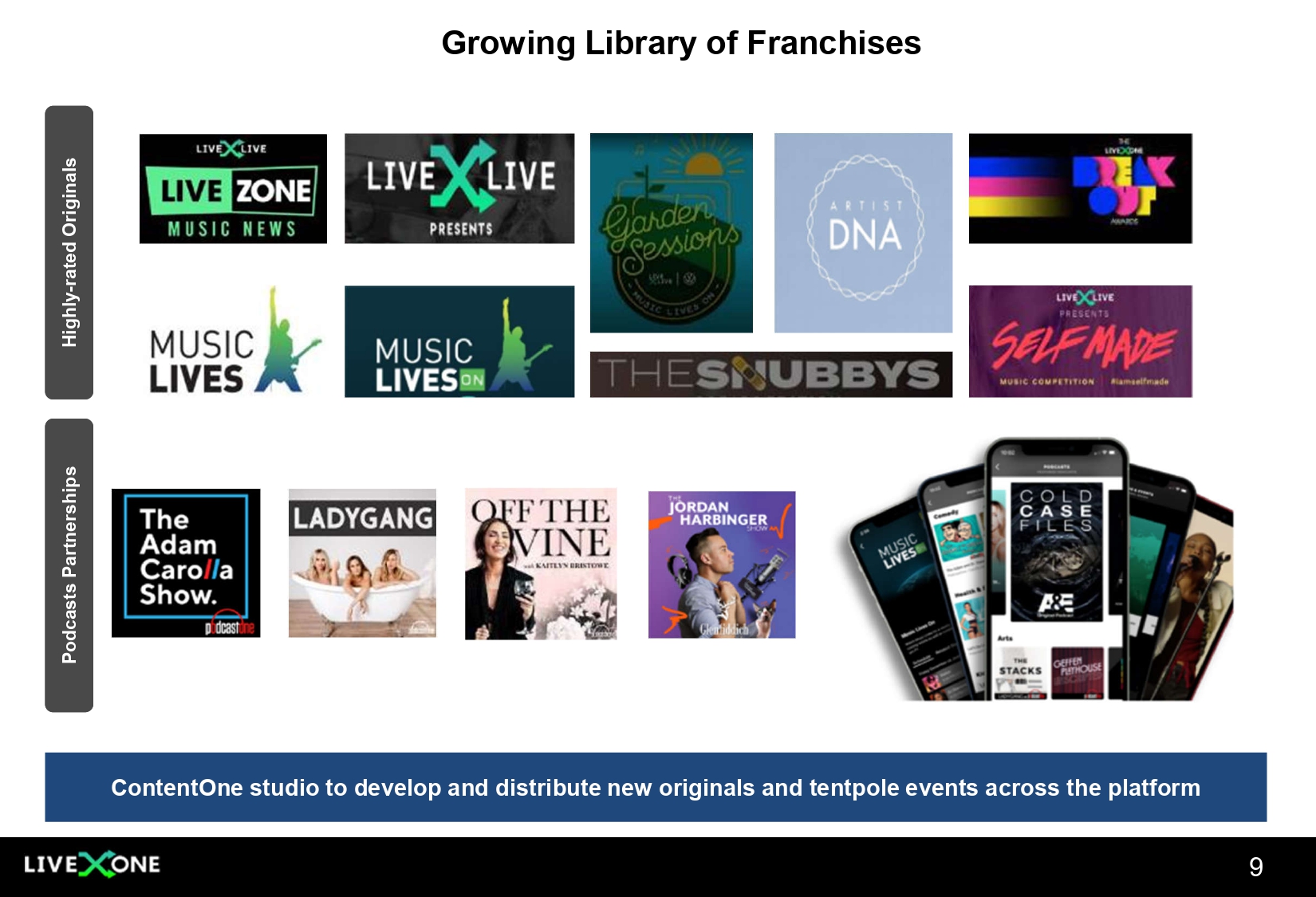 Investment Highlights 137K+ Tesla Members 3 5 6 Reported Q2 Fiscal Year 2026 (ended 09/30/2025) Consolidated Revenue of $18.8M and Adjusted EBITDA* of - $1.0M 1 2 7 Repurchased 4.4 million shares of common stock under LiveOne’s Share Stock Repurchase Program as of November 15, 2024, leaving capacity to repurchase an additional ~ $6.2M worth of shares 4 19 Full - Year Fiscal 2025 (ending 3/21/2025) Consolidated Revenue of $114.4M and Adjusted EBITDA* of $8.4M Raised PODC Guidance for FY26 to record Revenue of $56 - 60 million and record Adjusted EBITDA* of $4 - 6.5 million 19.4% Institutional Ownership at 11/18/2025, with Fidelity owning ~0.6 million shares. -- In addition, insiders beneficially own ~19% of LiveOne’s common shares * See About Non - GAAP Financial Measures in LiveOne’s SEC filings and press releases Completed Spinout of PodcastOne (Nasdaq: PODC) as a Separate Public Company with Special Dividend of PodcastOne Shares to LiveOne Shareholders