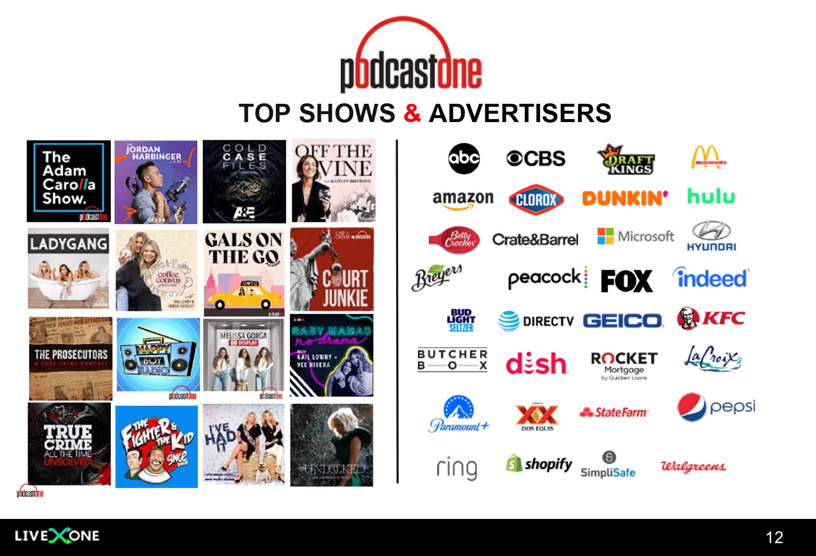 OVERVIEW PodcastOne (Nasdaq: PODC) is a leading advertiser - supported podcast company offering a 360 - degree solution for both content creators and advertisers. 350+ Episodes Produced Weekly 600M+ Annual Downloads 19M+ (IAB) Monthly Downloads 200+ Advertisers 6.4M+ Monthly Unique Listeners INDUSTRY STATS • 177M people listen to podcasts • Analysts predict podcast ad spending to exceed $2 Billion in 2026 • 67% of podcast audience feel close to the hosts of podcasts • 61% consider podcasts as part of their daily routine • LiveOne owns ~71% of PODC’s common stock and will continue to consolidate PODC’s financial results. • PODC reported Q2 FY 2026 (Ended 09/30/2025) Revenue of $15.2M and Adjusted EBITDA** of $1.1M 1 • Full Year FY2025 Revenue of $52.1M and Adjusted EBITDA** of - $501K 1 • PODC was 9 th in PODTRAC’s Podcast Industry Top Publishers Rankings for October 2025. • PODC currently has over 100 new podcasts in the pipeline and over 10 potential acquisitions. • PODC is now featured in over 1 million Tesla cars. • As of 11/18/2025, PODC had ~26.4M common shares outstanding. • Raised Fiscal 2026 Guidance: Revenue: $56 - 60 Million, Adjusted EBITDA*: $4.5 - 6 Million KEY PodcastOne UPDATES 1 See PodcastOne’s press release dated November 11, 2025 * See About Non - GAAP Financial Measures in PodcastOne’s SEC filings and press releases #9 Rank on Podtrac’s Top Podcast Publishers 11
